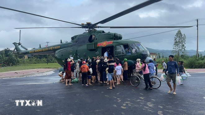 Người dân xã Phong Liên 1 và Phong Liên 2, tỉnh Đắk Lắk nhận hàng cứu trợ từ trực thăng của Trung đoàn Không quân 917. (Ảnh: TTXVN phát)