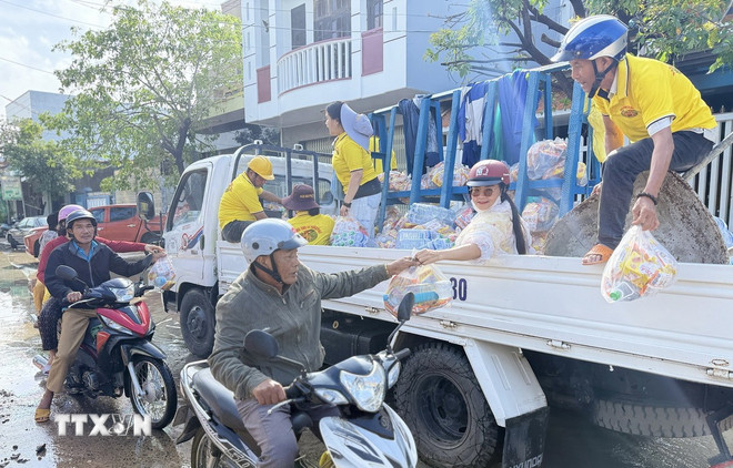 Từng đoàn cứu trợ trong và ngoài tỉnh tiếp tế cho người dân vùng lũ Đắk Lắk. (Ảnh: Tường Quân/TTXVN)