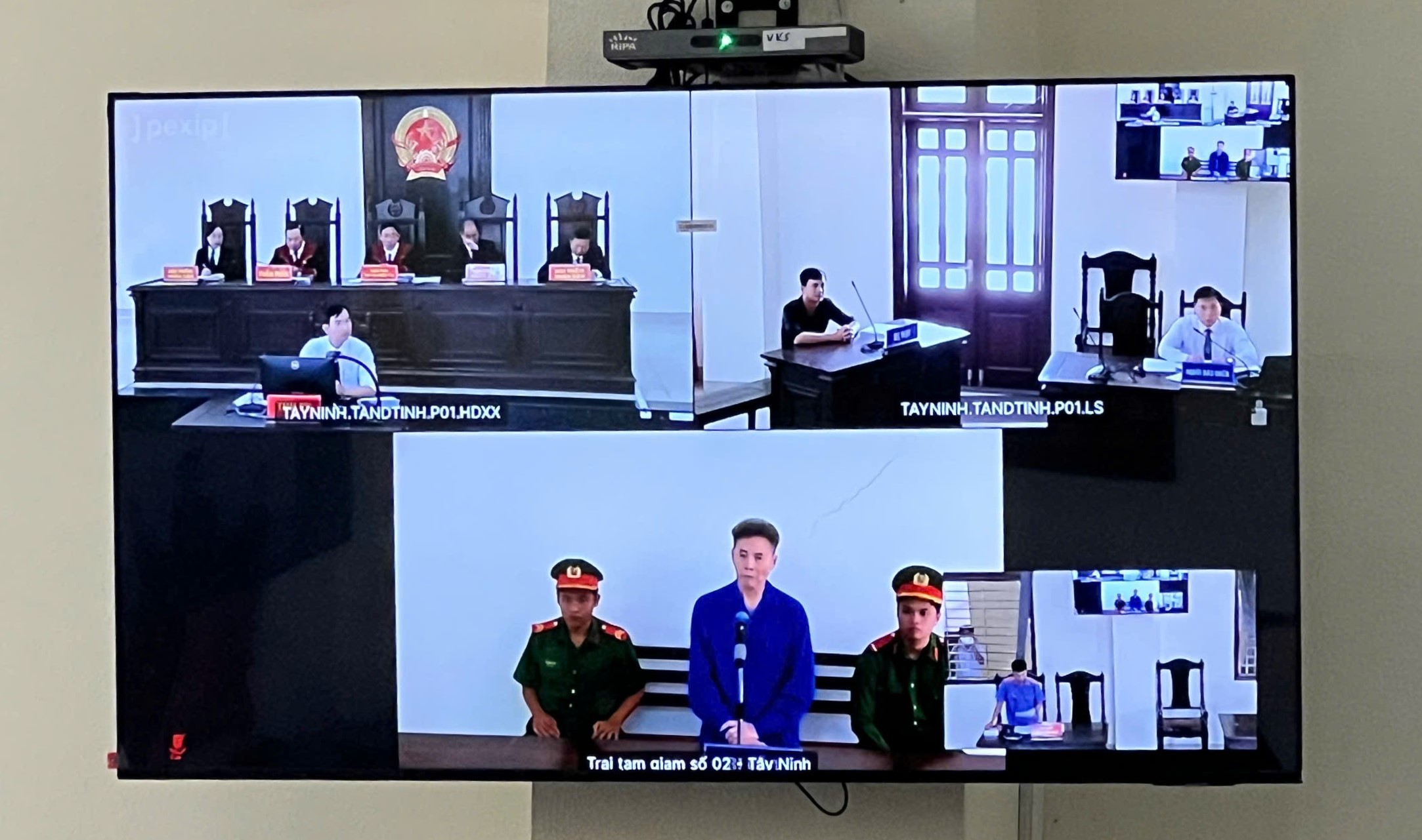 Phiên tòa xét xử bị cáo Hồ Trung Nga bằng hình thức trực tuyến. Ảnh: HUỲNH DU