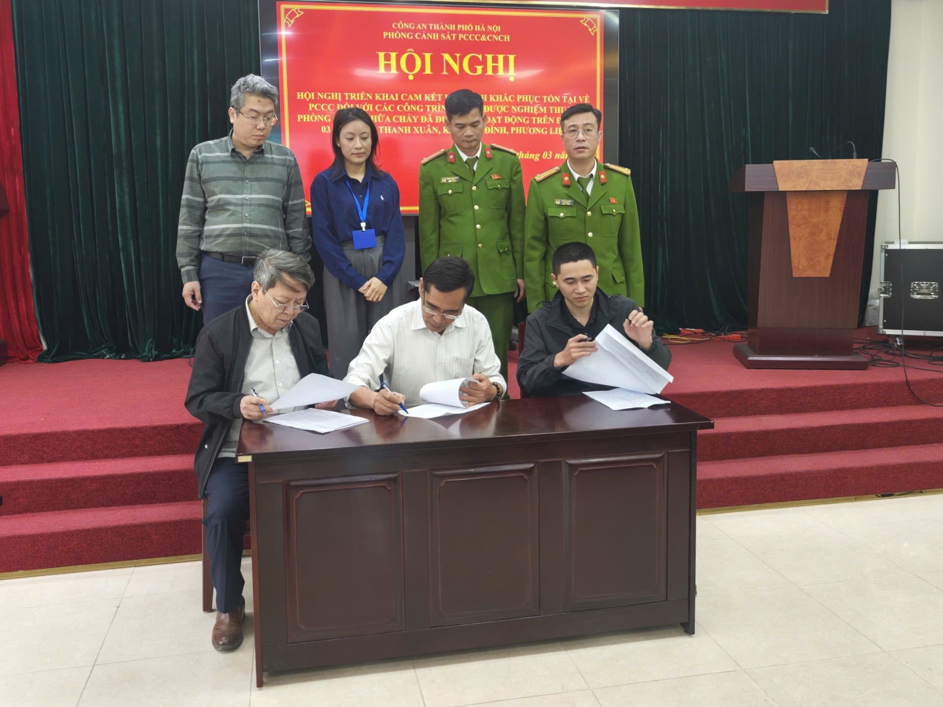 Đại diện cơ sở, công trình ký cam kết khắc phục các tồn tại về phòng cháy, chữa cháy theo đúng tiến độ. Ảnh: PH