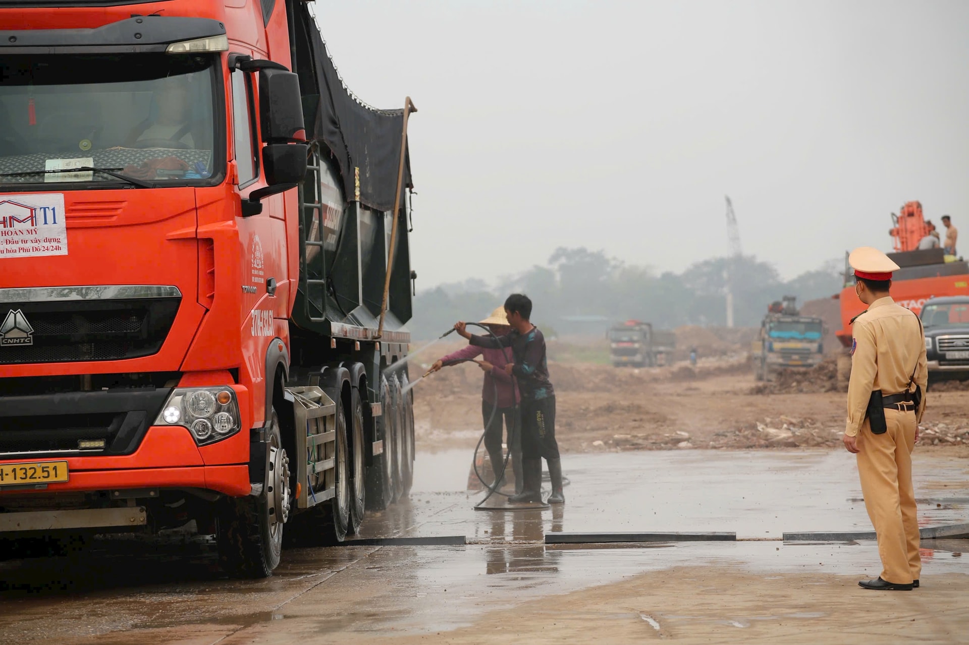 CSGT yêu cầu phương tiện ra khỏi công trường phải rửa sạch bùn đất. Ảnh: Phạm Công