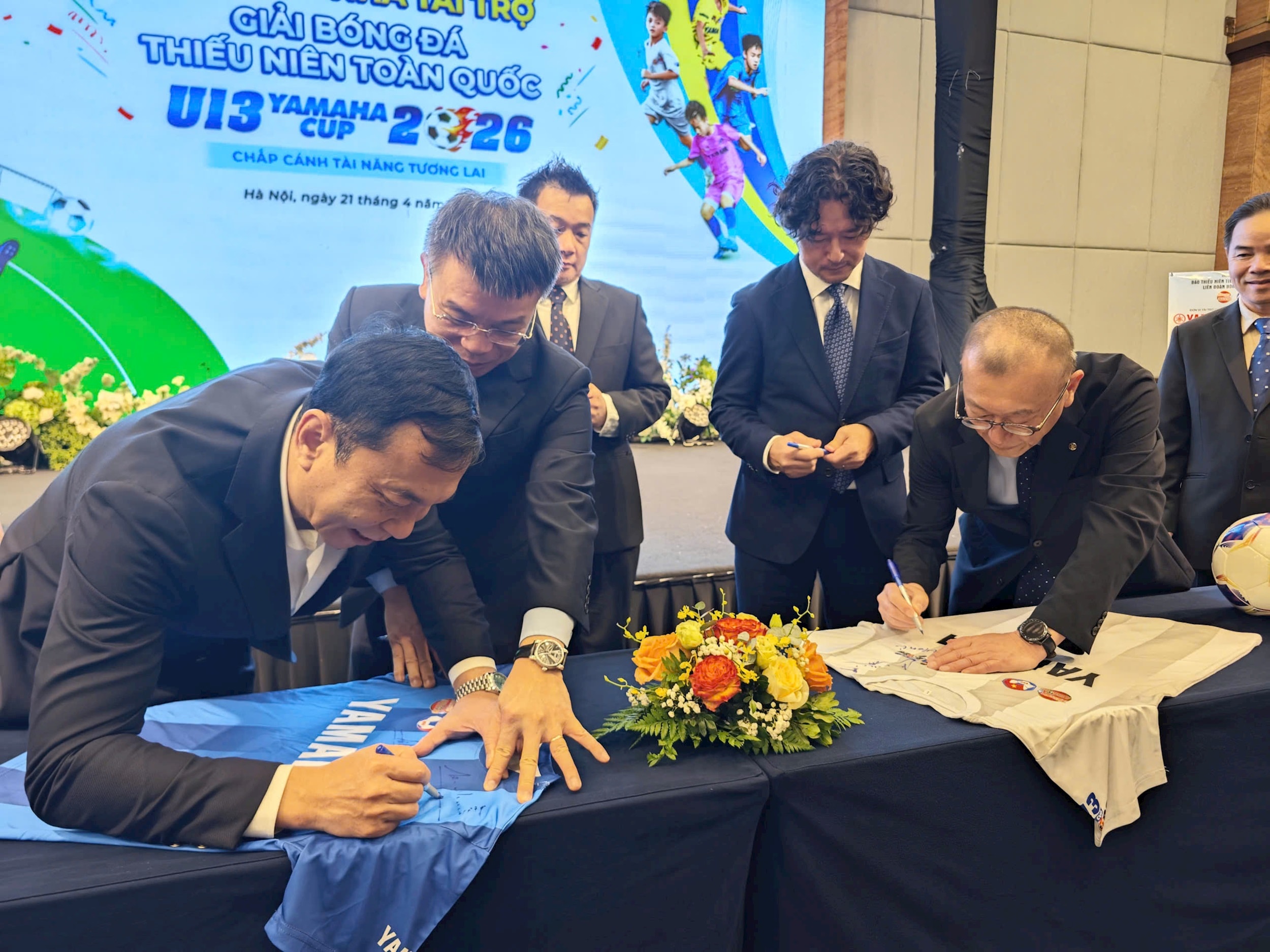 Chủ tịch VFF Trần Quốc Tuấn (bên trái) và đại diện nhà tài trợ Yamaha ký áo đấu. Ảnh: Hà Ngân
