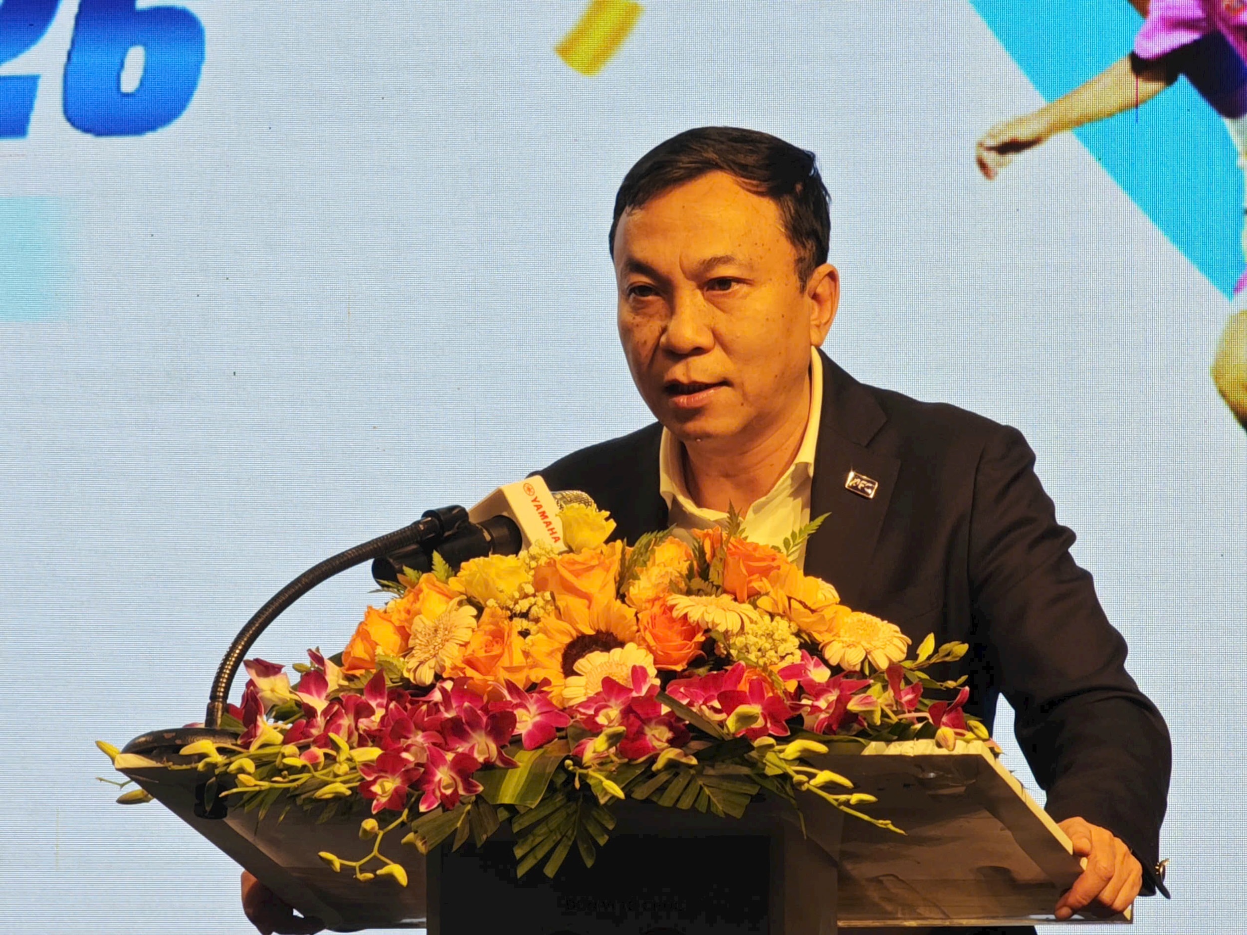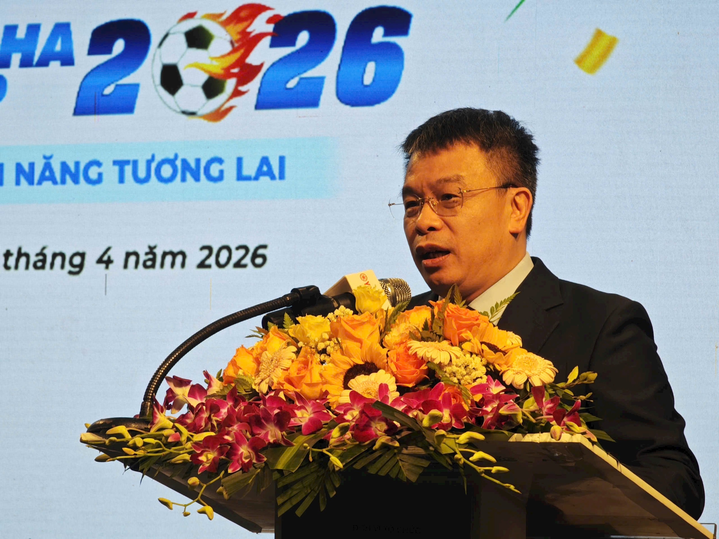 Ủy viên Ủy ban Thi đấu FIFA, Ủy viên Thường vụ AFC, Chủ tịch VFF Trần Quốc Tuấn phát biểu tại sự kiện. Ảnh: Hà Ngân