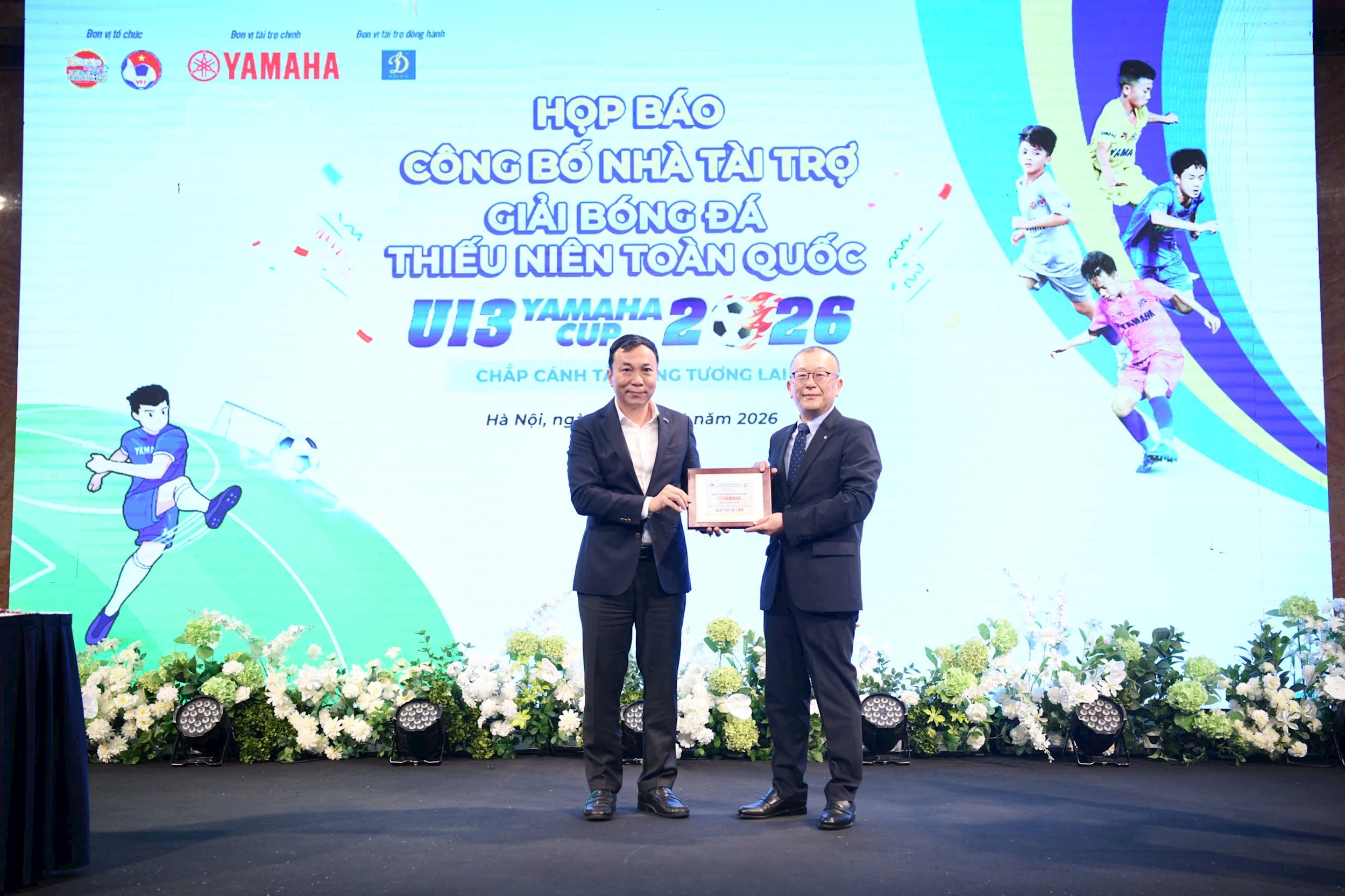 Chủ tịch VFF Trần Quốc Tuấn trao kỷ niệm chương cho nhà tài trợ Yamaha Motor Việt Nam. Ảnh: VFF