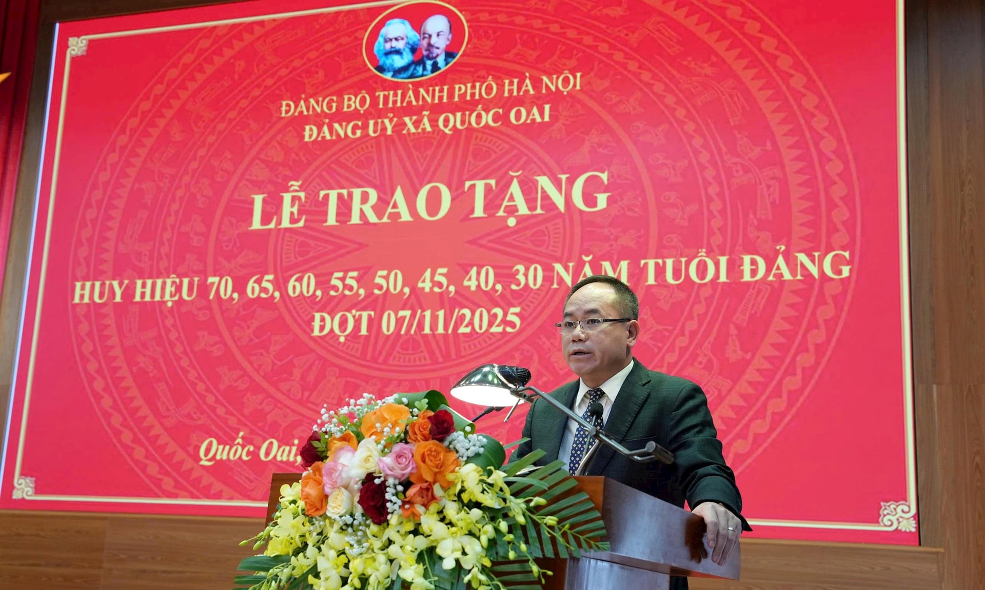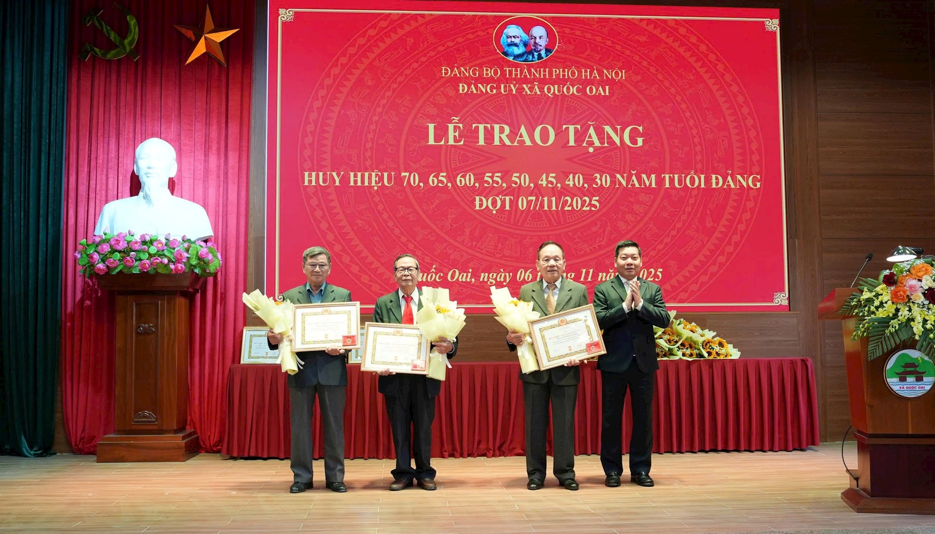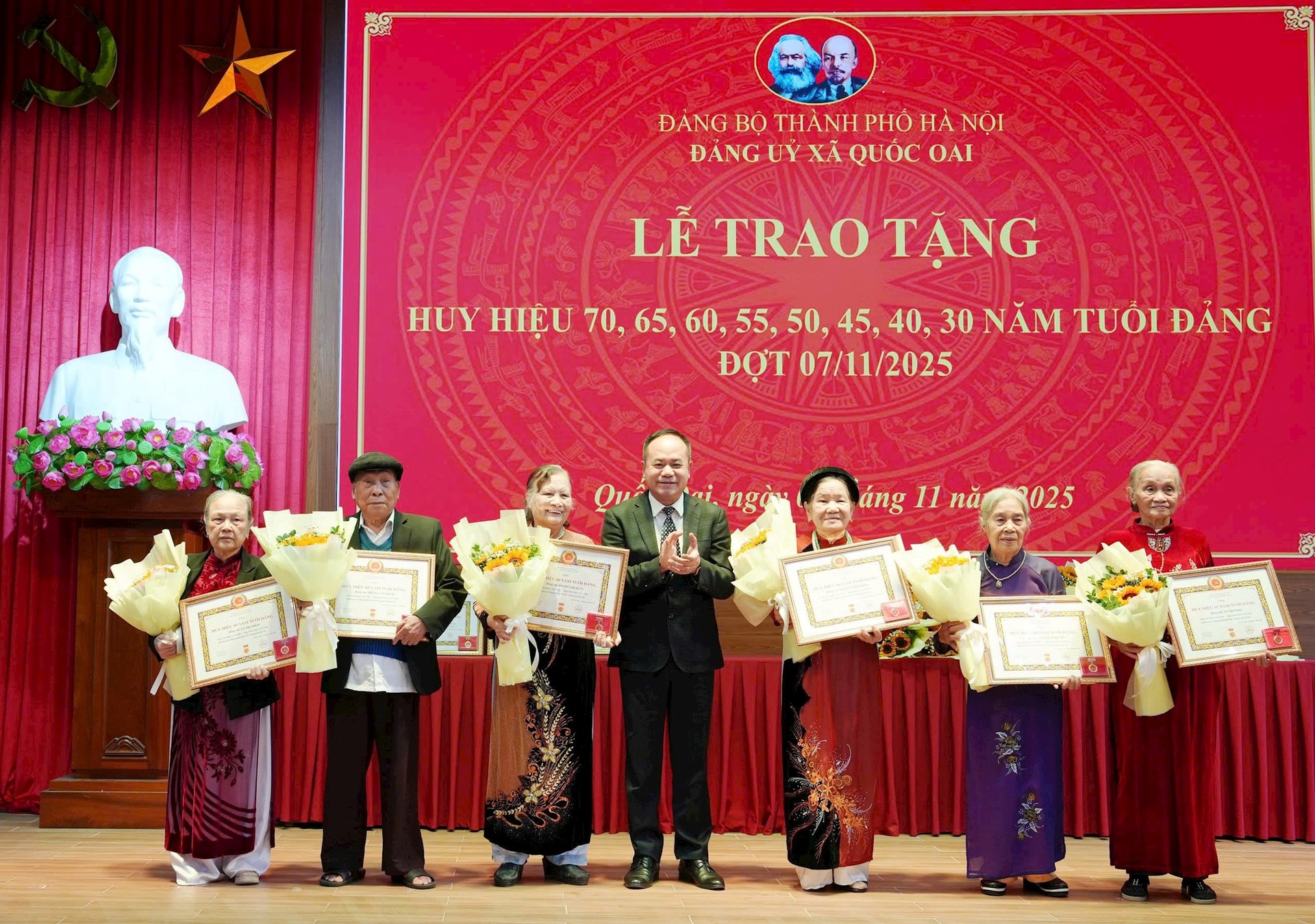 Trong đợt này, xã Quốc Oai vinh dự có 26 đảng viên được nhận Huy hiệu Đảng. Trong đó có 1 đảng viên nhận Huy hiệu 70 năm tuổi Đảng là đồng chí Nguyễn Thị Toản (sinh năm 1934); 1 đồng chí nhận Huy hiệu 65 năm tuổi Đảng, 7 đồng chí nhận Huy hiệu 60 năm tuổi Đảng; 1 đồng chí 55 năm tuổi Đảng, 2 đồng chí 50 năm tuổi Đảng, 5 đồng chí 45 năm tuổi Đảng, 5 đồng chí 40 năm tuổi Đảng và 4 đồng chí 30 năm tuổi Đảng.