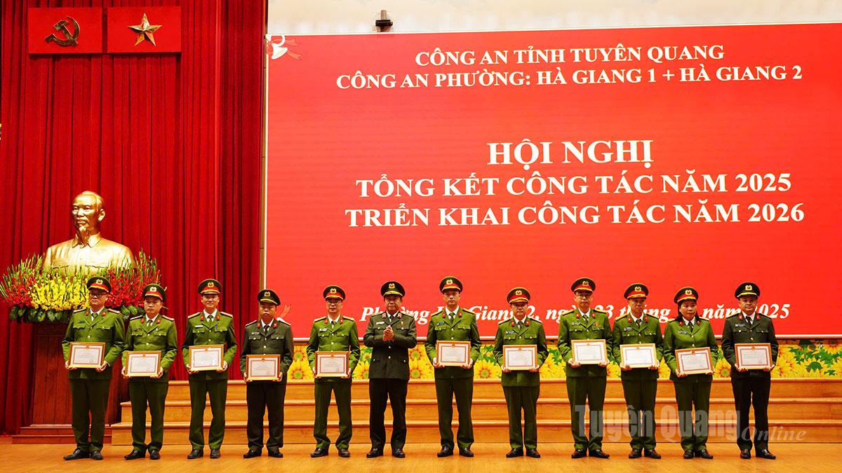 Giám đốc Công an tỉnh Nguyễn Đức Thuận tặng Giấy khen cho các cán bộ, chiến sĩ Công an phường Hà Giang 1 và phường Hà Giang 2.