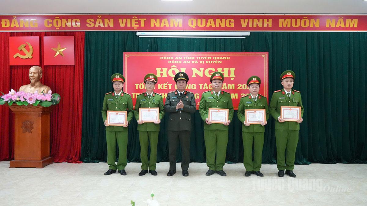 Đồng chí Giám đốc Công an tỉnh Nguyễn Đức Thuận tặng Giấy khen cho cán bộ, chiến sĩ Công an xã Vị Xuyên.