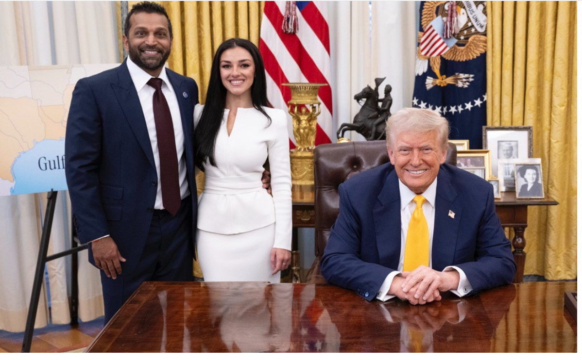 Giám đốc FBI Kash Patel và bạn gái Alexis Wilkins chụp ảnh cùng Tổng thống Mỹ Donald Trump. Ảnh: X/@AlexisWikins