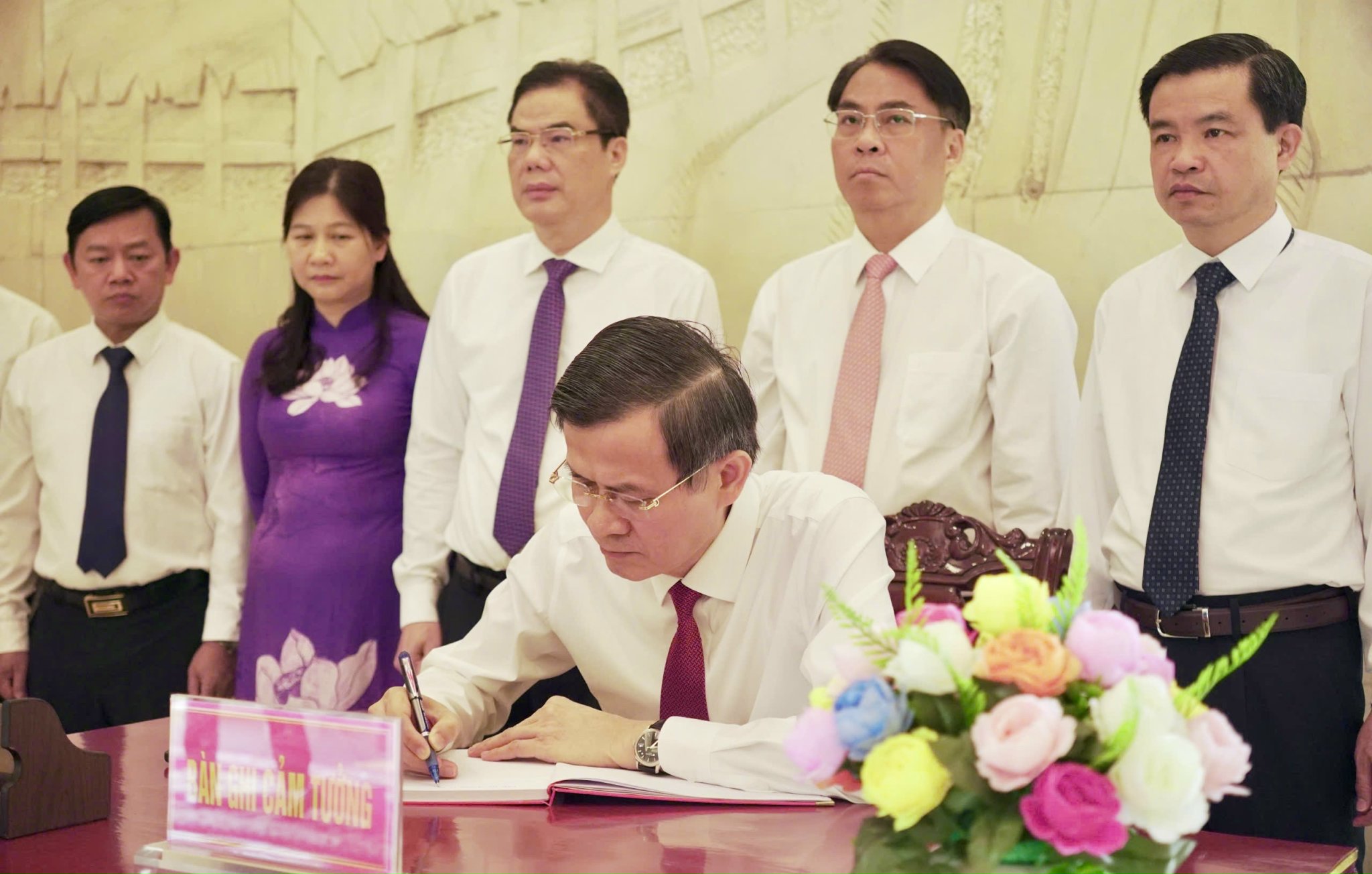 Giám đốc Học viện Chính trị Quốc gia Hồ Chí Minh Đoàn Minh Huấn ghi cảm tưởng vào Sổ vàng lưu niệm.