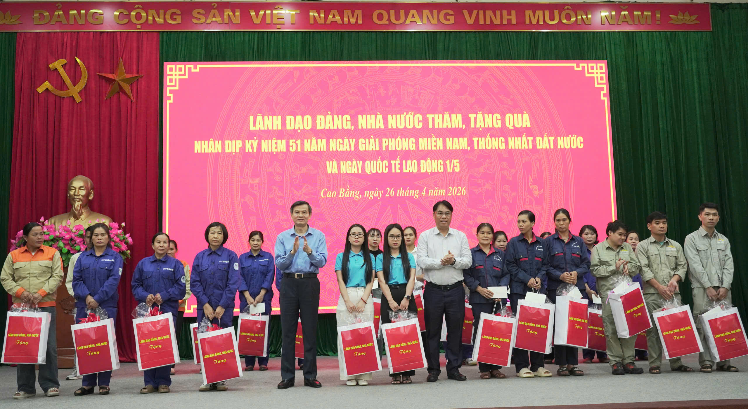 Giám đốc Học viện Chính trị Quốc gia Hồ Chí Minh Đoàn Minh Huấn và Bí thư Tỉnh ủy, Chủ tịch HĐND tỉnh Phan Thăng An tặng quà công nhân, người lao động có hoàn cảnh khó khăn.