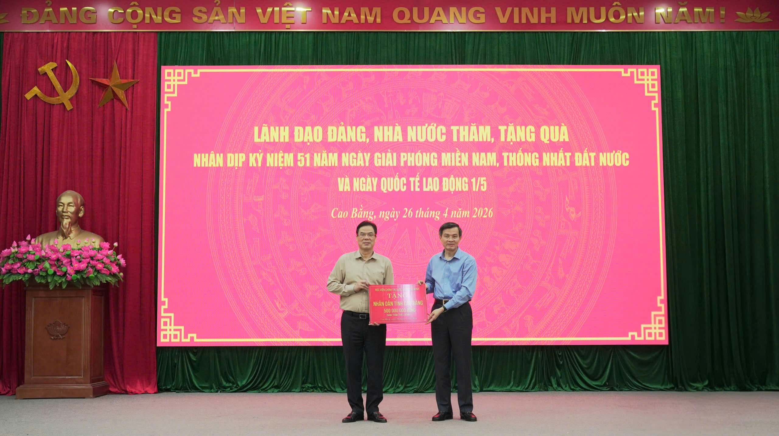 Giám đốc Học viện Chính trị Quốc gia Hồ Chí Minh Đoàn Minh Huấn trao kinh phí hỗ trợ an sinh xã hội cho tỉnh Cao Bằng.