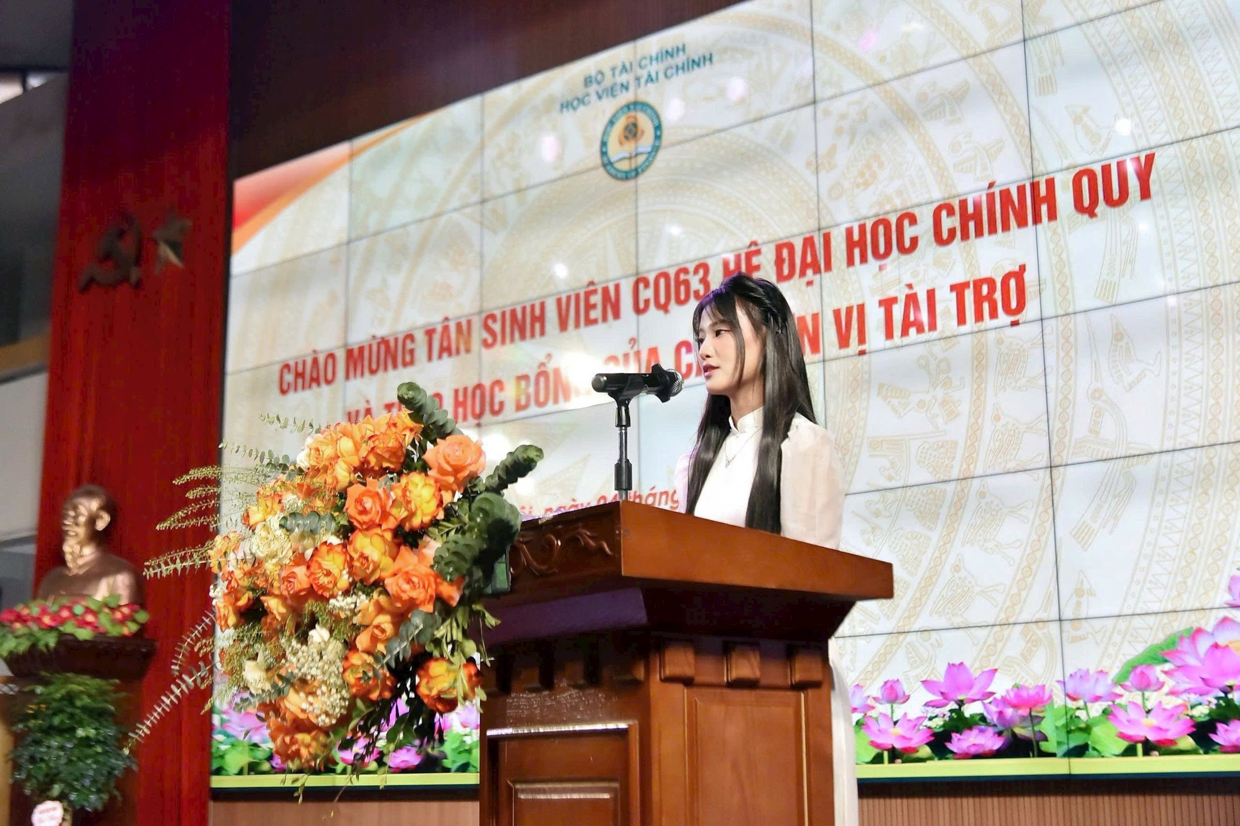 Đại diện các tân sinh viên phát biểu, em Trịnh Hương Giang, lớp CQ63.10.01QT.01 khoa Kế toán, chuyên ngành Kiểm toán, bày tỏ niềm tự hào, xúc động khi được trở thành tân sinh viên của Học viện Tài chính.