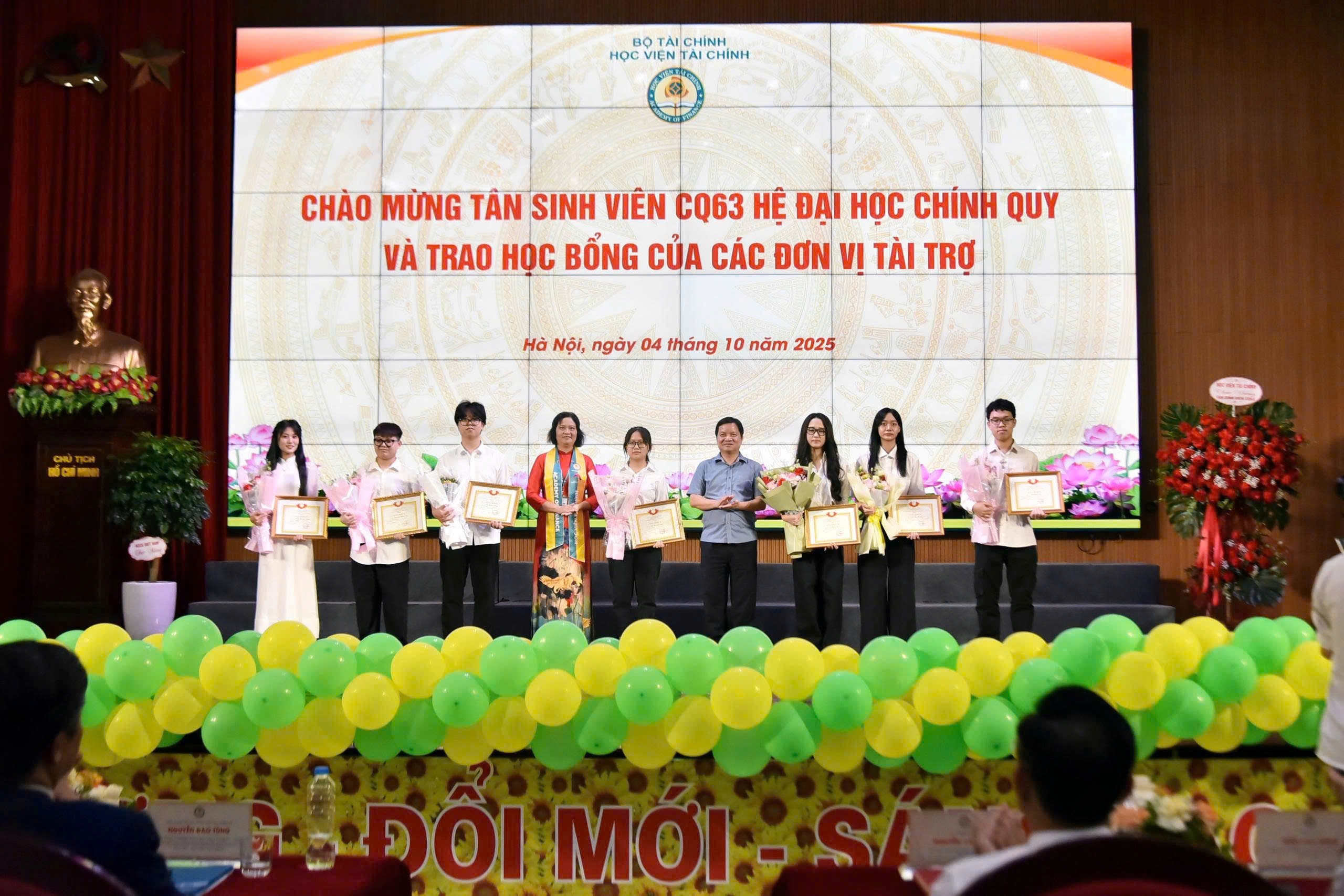 Lãnh đạo Học viện Tài chính vinh danh thủ khoa cùng các sinh viên đạt thành tích cao trong kỳ tuyển sinh năm 2025. Ảnh: Đào Loan
