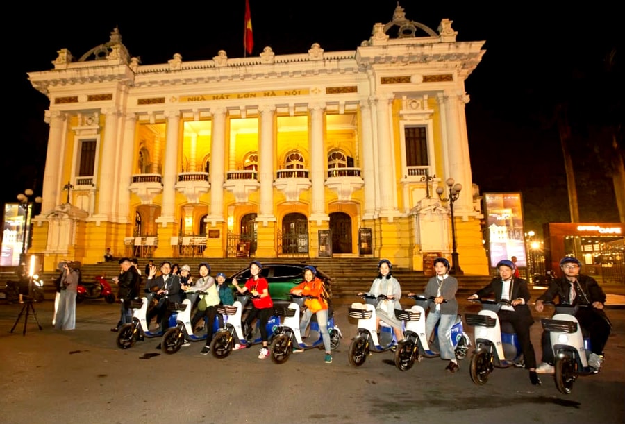 Du khách trải nghiệm tour xe đạp đêm “Hà Nội Đẹp Sound”.