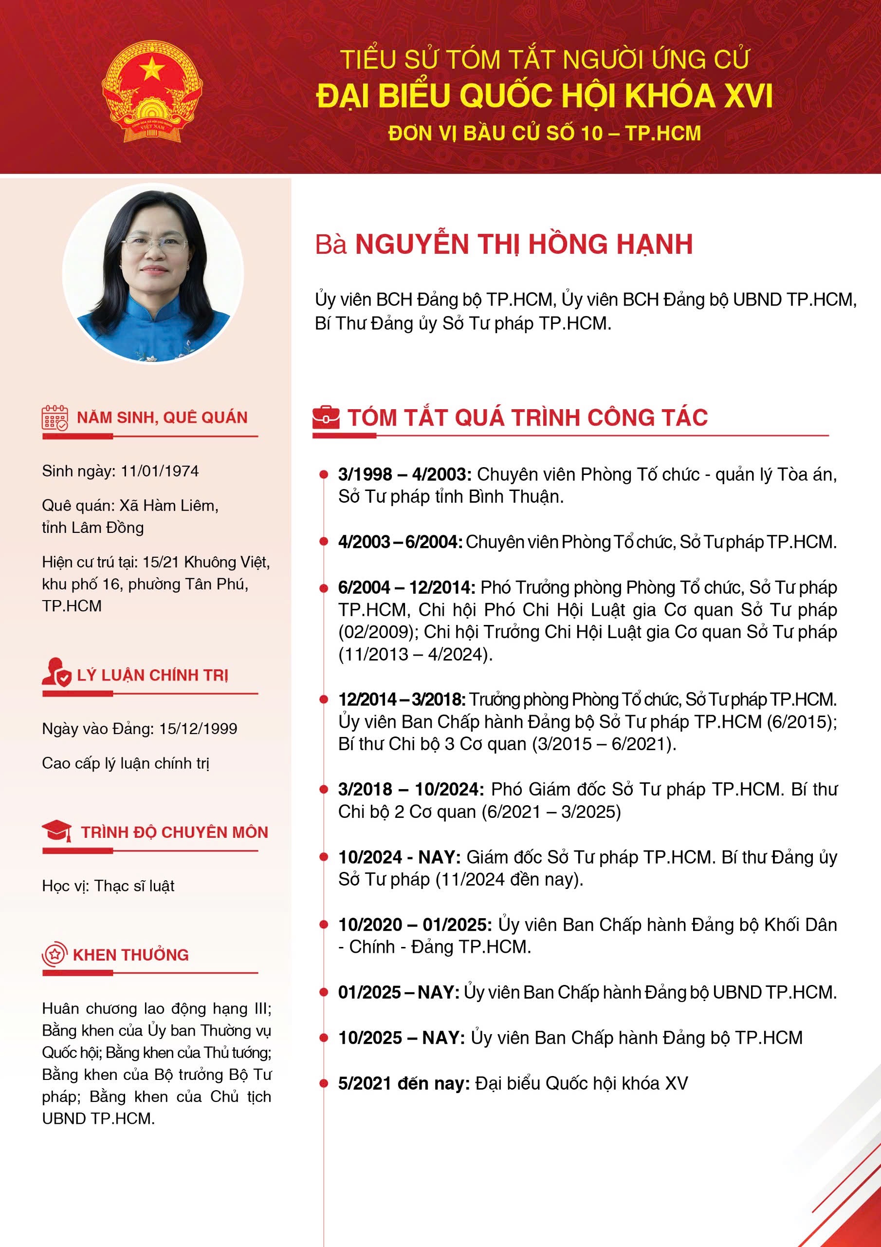 Trong không khí ấy, chúng tôi đã có cuộc trò chuyện với bà Nguyễn Thị Hồng Hạnh, Giám đốc Sở Tư pháp TP.HCM, ứng cử viên ĐBQH khóa XVI. Gần 30 năm gắn bó với ngành tư pháp và kinh nghiệm thực tiễn từ nhiệm kỳ ĐBQH khóa XV, bà chia sẻ góc nhìn thẳng thắn về câu chuyện khơi thông thể chế, những vấn đề cần thực hiện, cùng TP khai mở tối đa các cơ chế đặc thù để kiến tạo môi trường sống xanh và bền vững.