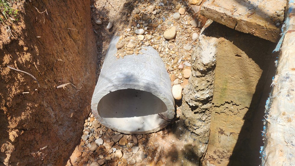 Thế nhưng thực tế, tại vị trí hạ cống vẫn còn đọng nước ở đáy, đơn vị thi công không bơm thoát hay xử lý nền mà cho máy xúc thả trực tiếp ống cống xuống. Sau đó, chỉ rải sơ sài vài gàu đá sỏi rồi cho công nhân dùng tay trét vội xi măng vào mối nối giữa các ống cống. Ngay sau đó, đất được xúc xuống lấp lại.