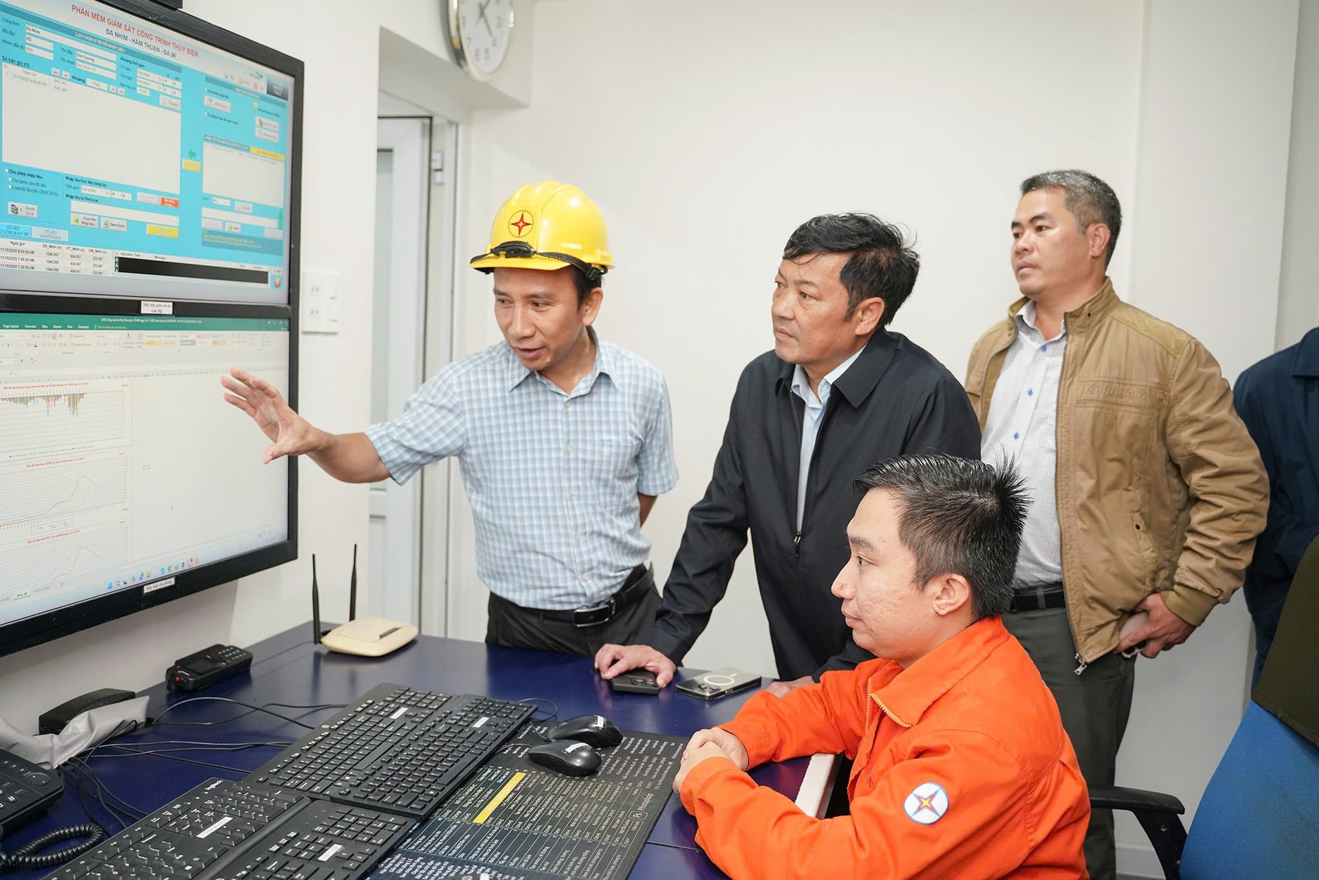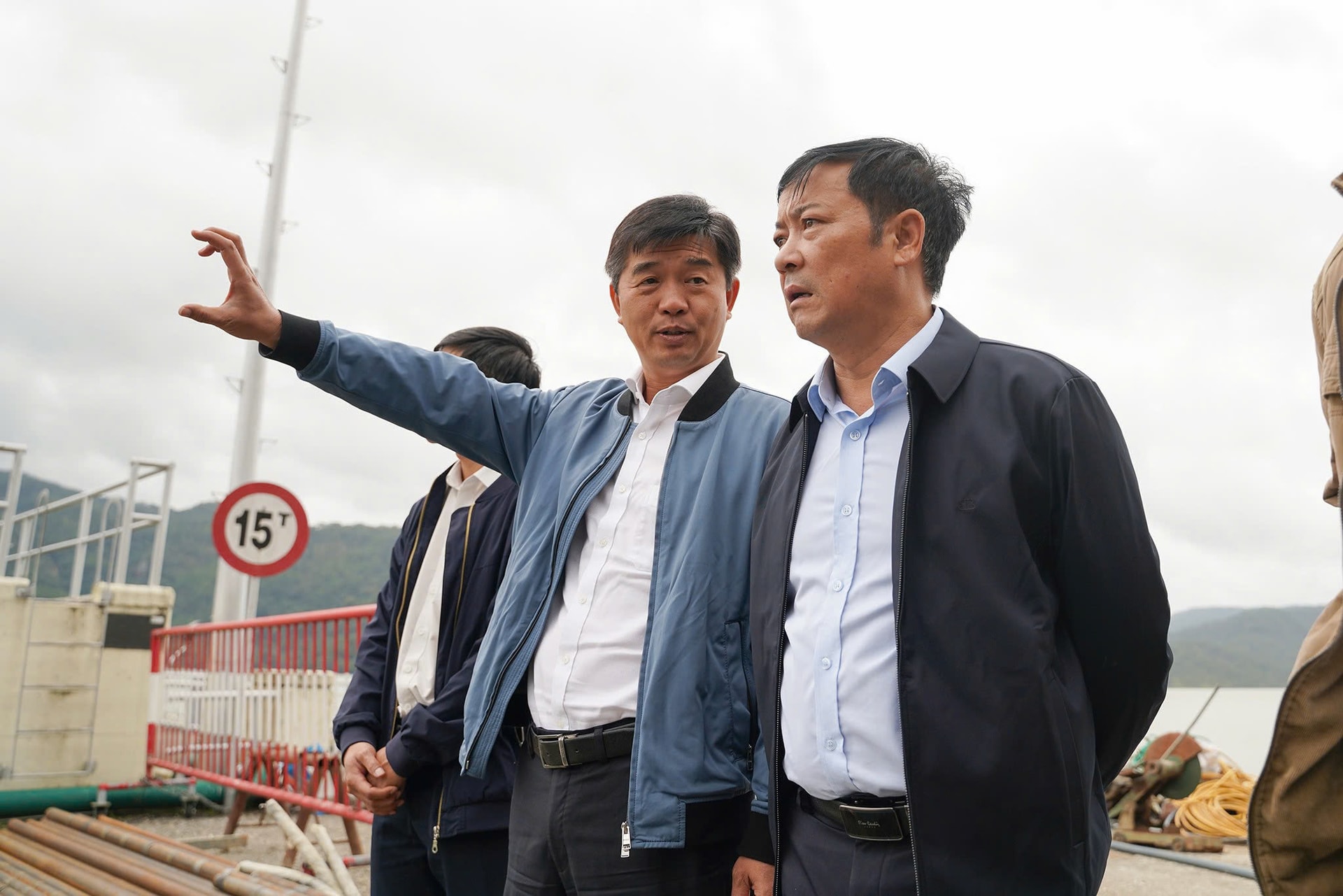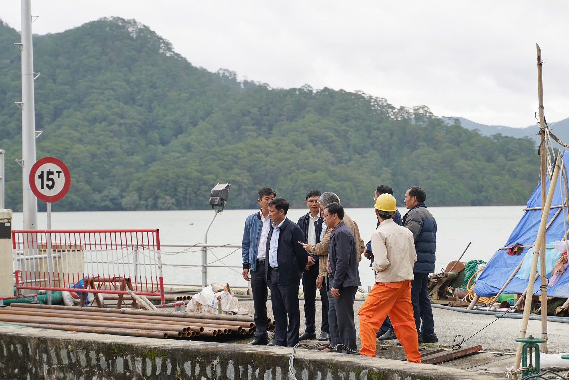Ông Đỗ Minh Lộc (mang nón bảo hộ) Phó Tổng Giám đốc Công ty Cổ phần Thủy điện Đa Nhim - Hàm Thuận - Đa Mi báo cáo Phó Chủ tịch Thường trực UBND tỉnh về công tác vận hành hồ thủy điện Đơn Dương
