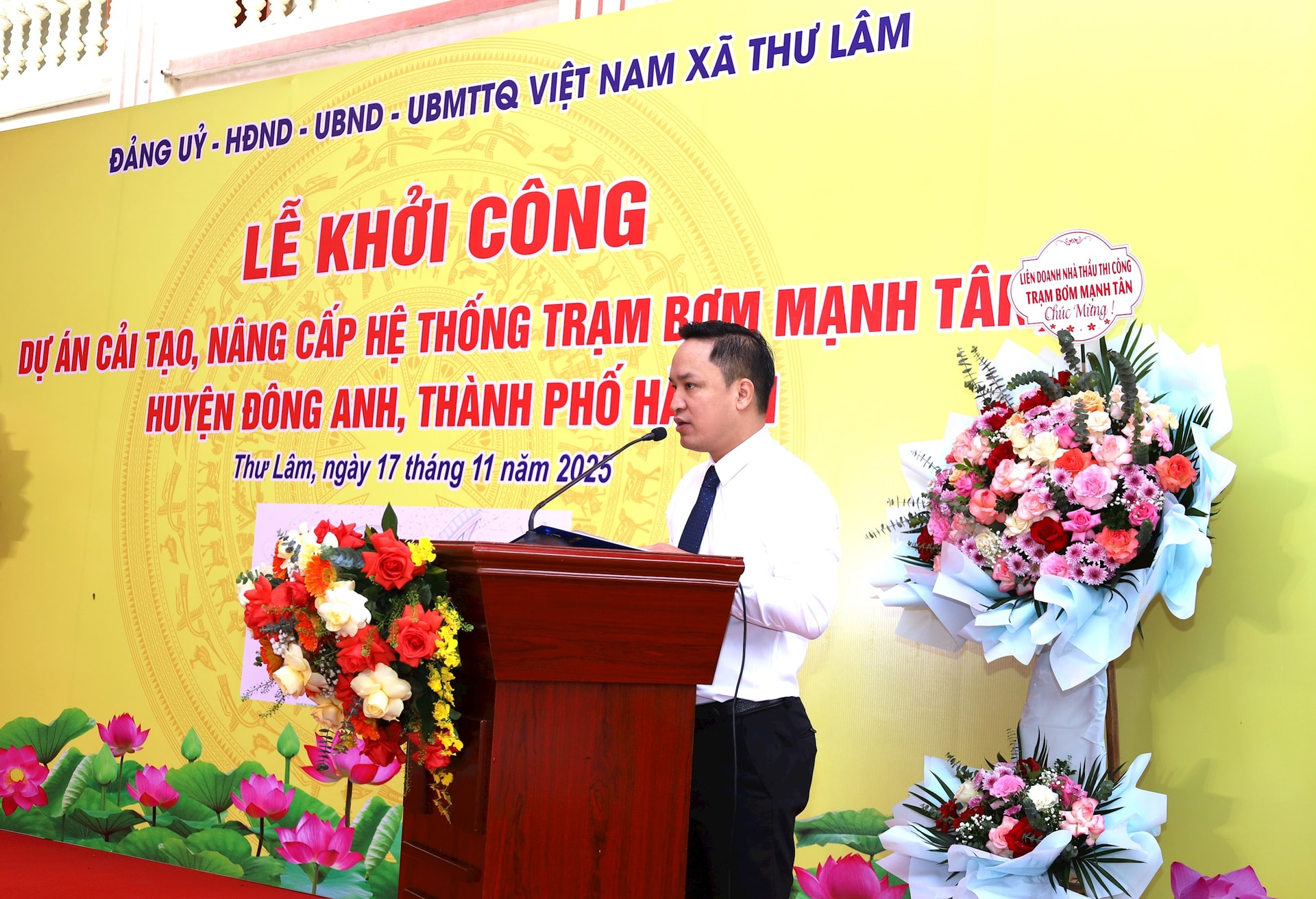 Giám đốc Ban Quản lý dự án đầu tư xây dựng xã Thư Lâm Tô Anh Duy phát biểu tại lễ khởi công. Ảnh: Kim Nhuệ