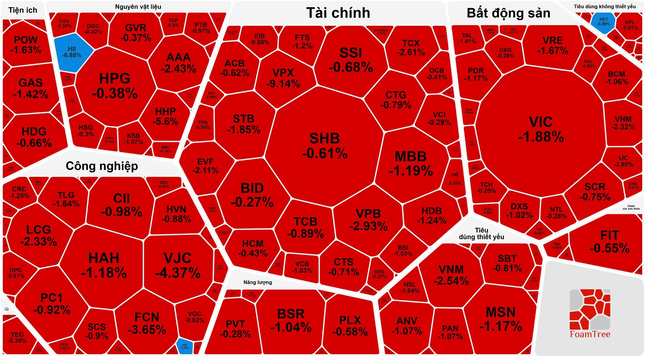 Nhóm ngân hàng cũng đồng loạt điều chỉnh, góp phần kéo VN-Index lao dốc sâu hơn: VPB giảm 2,93%, STB giảm 1,85%, HDB giảm 1,24%, MBB giảm 1,19%, VCB giảm 1,03%; các mã SHB, ACB, CTG, TCB, BID, VIB giảm gần 1%.