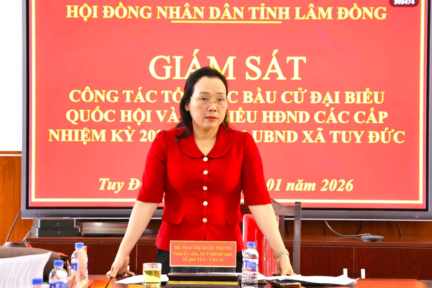Đồng chí Mai Thị Xuân Trung, Tỉnh ủy viên, Phó Chủ tịch HĐND tỉnh phát biểu tại buổi làm việc với Ủy ban Bầu cử xã Tuy Đức về công tác bầu cử đại biểu Quốc hội khóa XVI và đại biểu HĐND các cấp, nhiệm kỳ 2026–2031