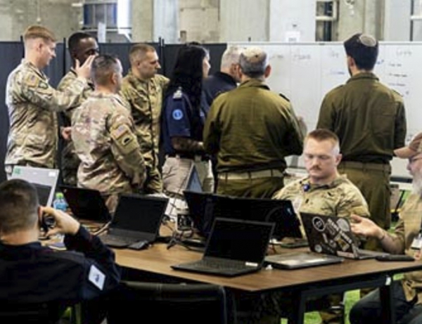 Nhân viên Lục quân Mỹ, lực lượng Phòng vệ Israel (IDF) và các quan chức quốc tế trong cuộc họp hôm 20/11 tại Trung tâm Điều phối Dân sự - Quân sự (CMCC) ở Kiryat Gat, Israel. Ảnh: Getty Images
