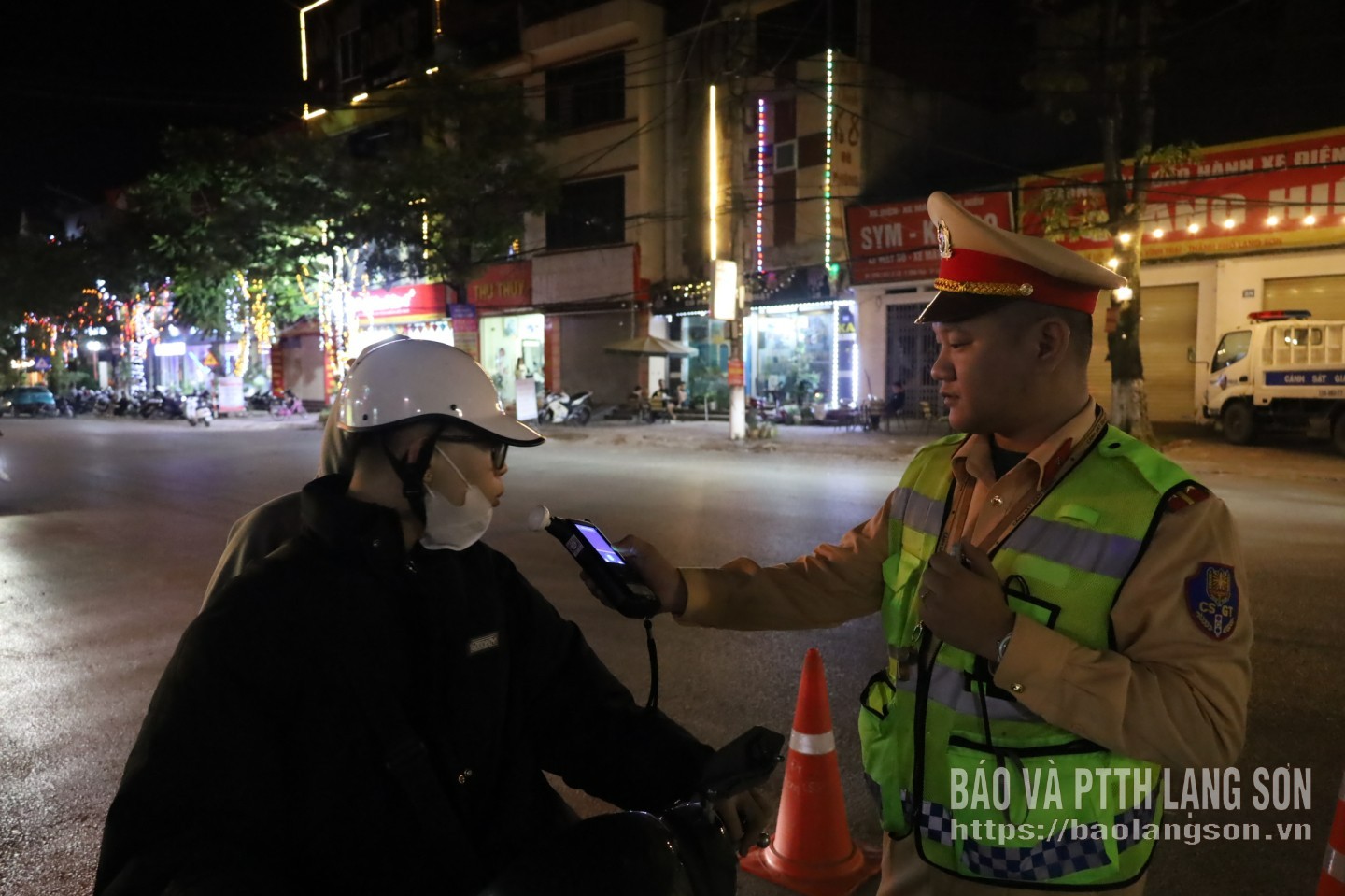 Cán bộ Phòng Cảnh sát giao thông kiểm tra nồng độ cồn người tham gia giao thông trên đường Lê Lợi, phường Đông Kinh