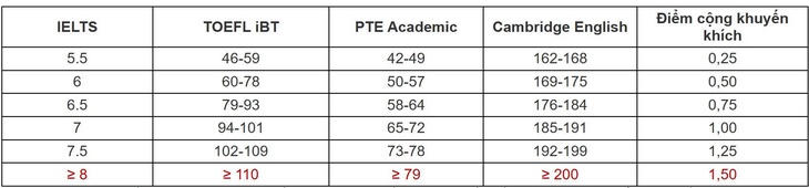 Theo bảng quy đổi điểm chứng chỉ quốc tế mà nhà trường công bố, IELTS 5.5 tương đương 8 điểm; 6.0 tương đương 8,5 điểm; 6.5 tương đương 9 điểm; 7.0 tương đương 9,5 điểm và từ 7.5 đến 9.0 tương đương 10 điểm.