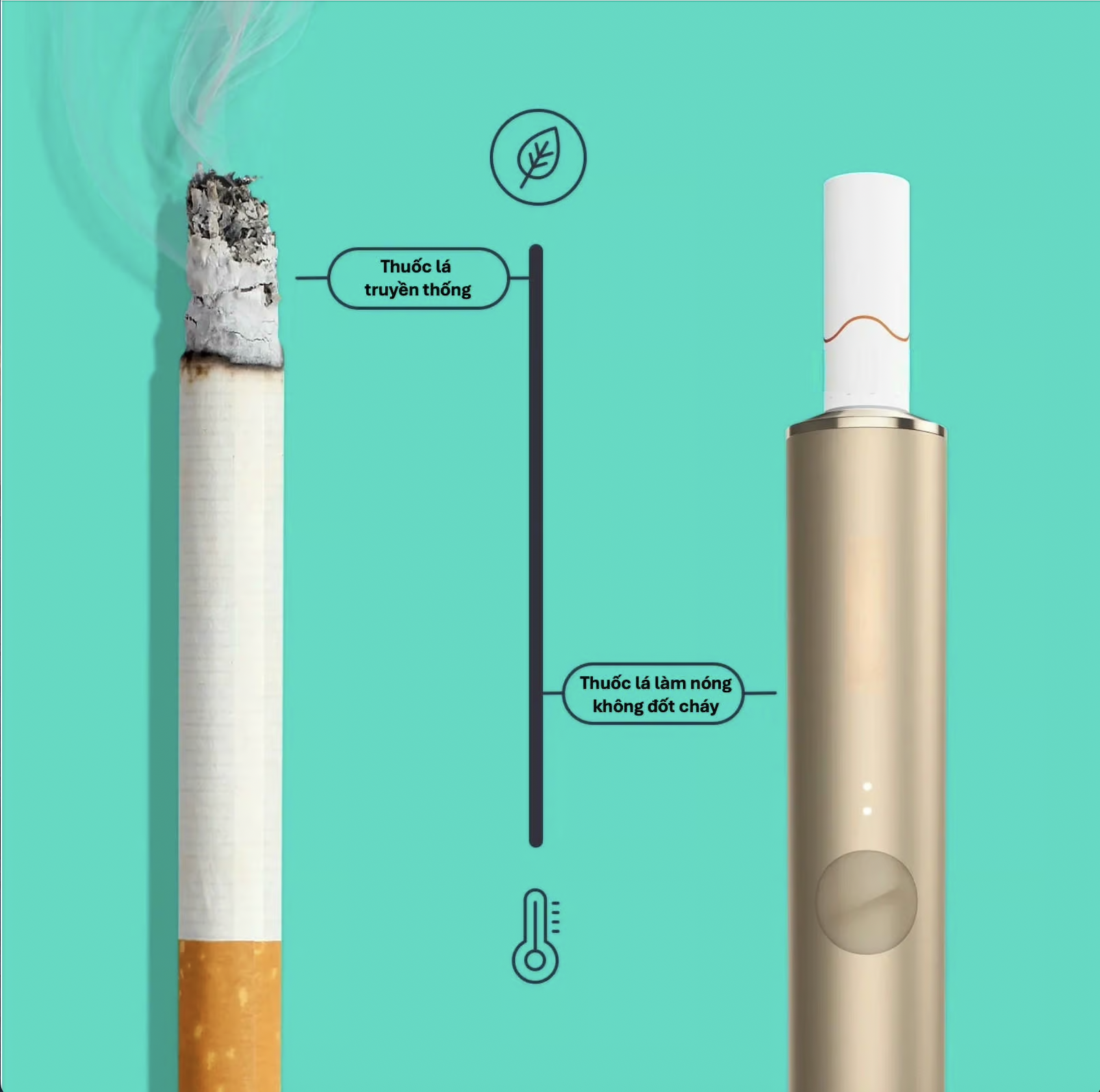 Còn với TLNN, người dùng chỉ cần dùng thiết bị để làm nóng ở mức nhiệt độ giới hạn đủ để giải phóng nicotine từ nguyên liệu thuốc lá mà không làm cháy điếu thuốc, do đó không tạo ra khói, tàn thuốc, cũng như không có tar.