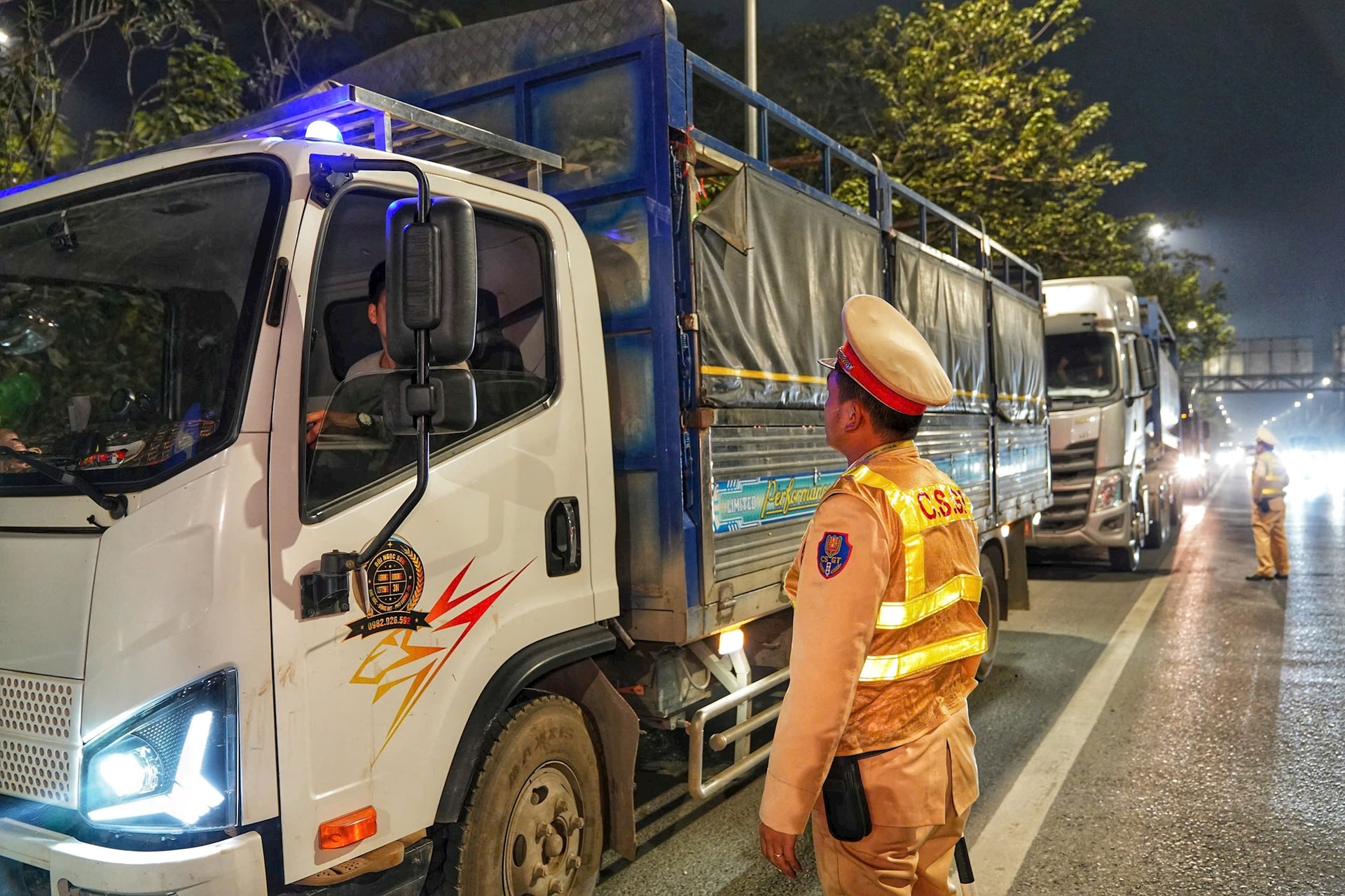Ghi nhận trong tối 11-1, nhằm bảo đảm các phương tiện thực hiện nghiêm phương án thí điểm hạn chế xe ô tô tải vào Vành đai 3 trên cao, tổ công tác thuộc Đội Cảnh sát giao thông đường bộ số 6 (Phòng Cảnh sát giao thông, Công an thành phố Hà Nội) đã tăng cường tuần tra lưu động trên tuyến Đại lộ Thăng Long, Quốc lộ 32 nhằm tuyên truyền, nhắc nhở các tài xế điều khiển phương tiện hơn 10 tấn không "án ngữ" hoặc dừng đỗ trên các tuyến đường để chờ hết giờ hạn chế. Tổ công tác cũng nhắc nhở các tài xế cần chủ động sắp xếp lộ trình trước khi vào khung giờ hạn chế, tránh việc dừng đỗ gây cản trở giao thông.