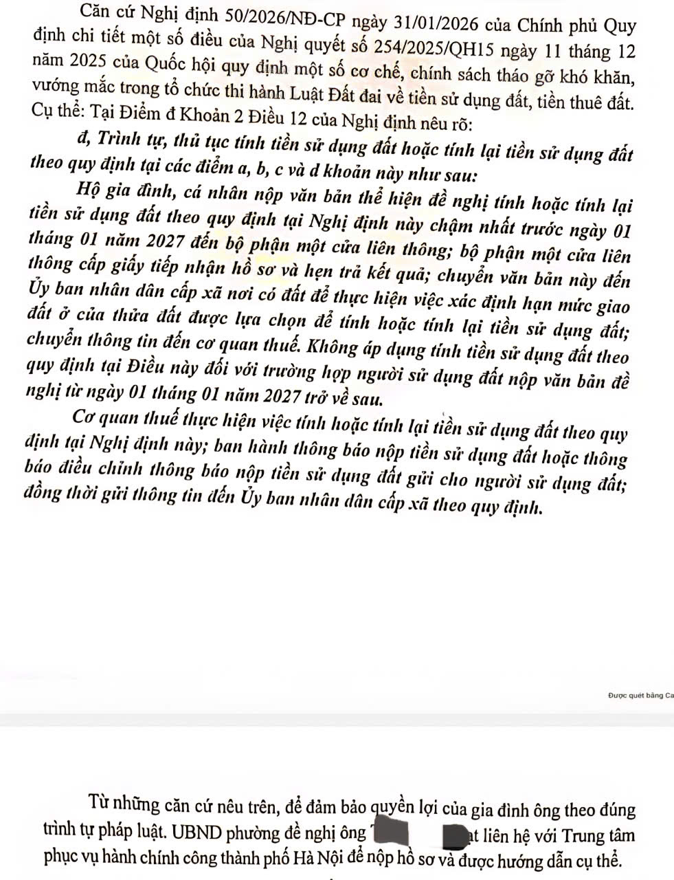 Cụ thể, theo quy định chuyển tiếp tại Nghị quyết 254 và Nghị định 50/2026: Nếu cơ quan thuế chưa ban hành thông báo nộp tiền SDĐ, người dân sẽ được tính theo mức ưu đãi mới. Nếu đã có thông báo nhưng chưa nộp tiền, người dân được đề nghị tính lại. Nếu đã nộp một phần hoặc toàn bộ, người dân vẫn có quyền yêu cầu tính lại để được hoàn trả phần chênh lệch.