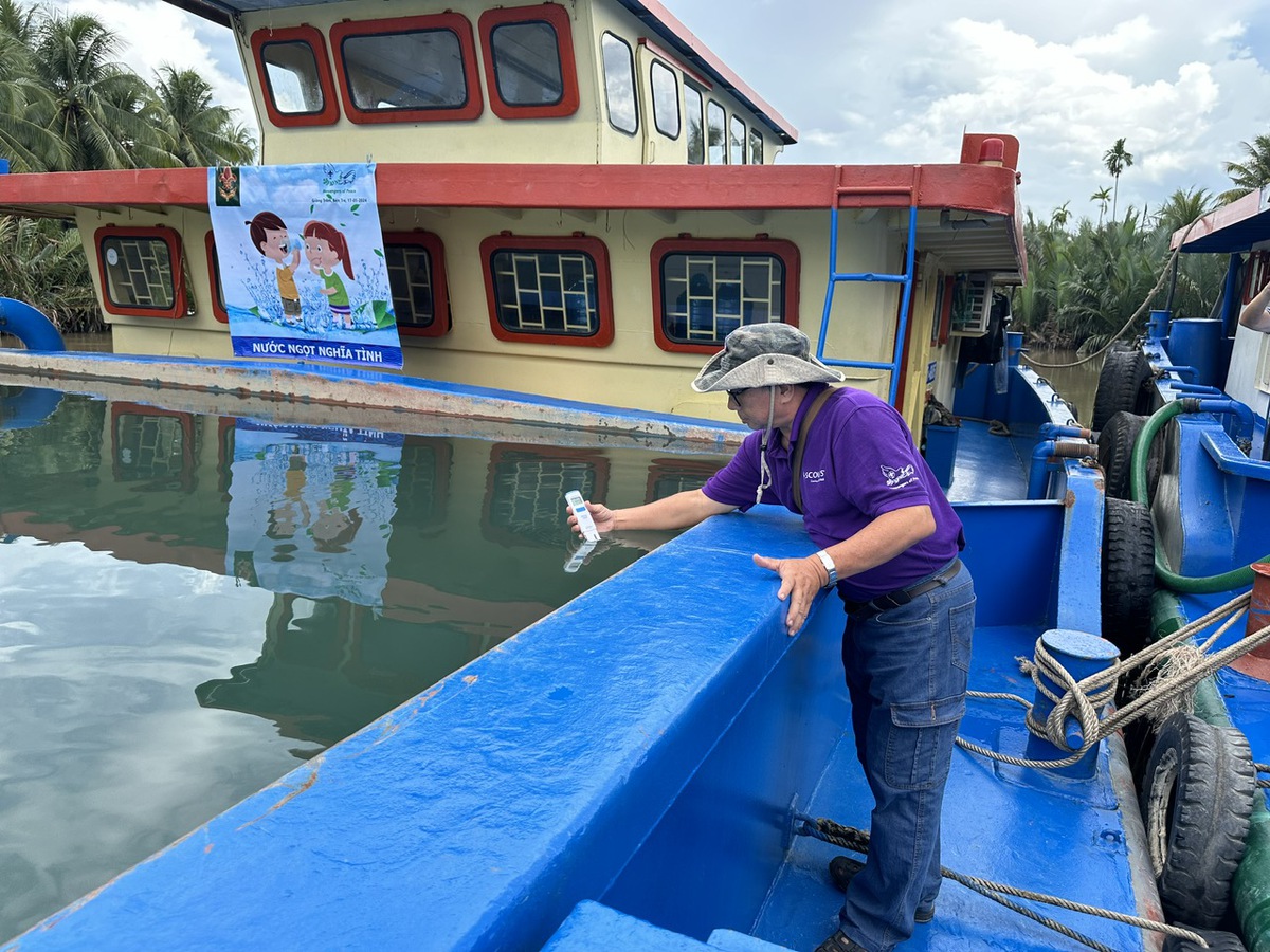 PGS.TS Lê Anh Tuấn đo độ mặn của nước. Ảnh: NVCC