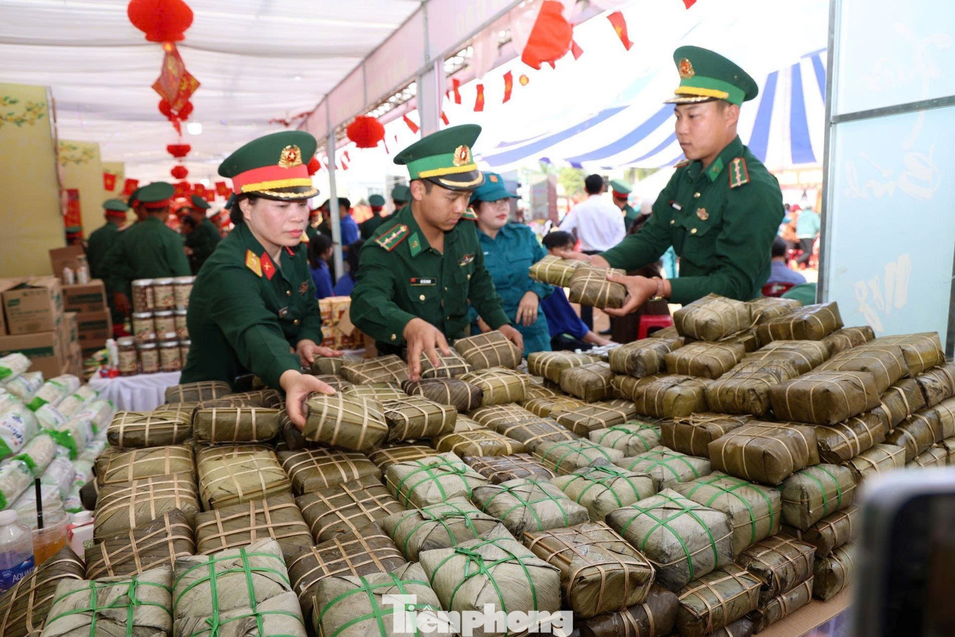 Hàng trăm bánh chưng được chuẩn bị phục vụ người dân.