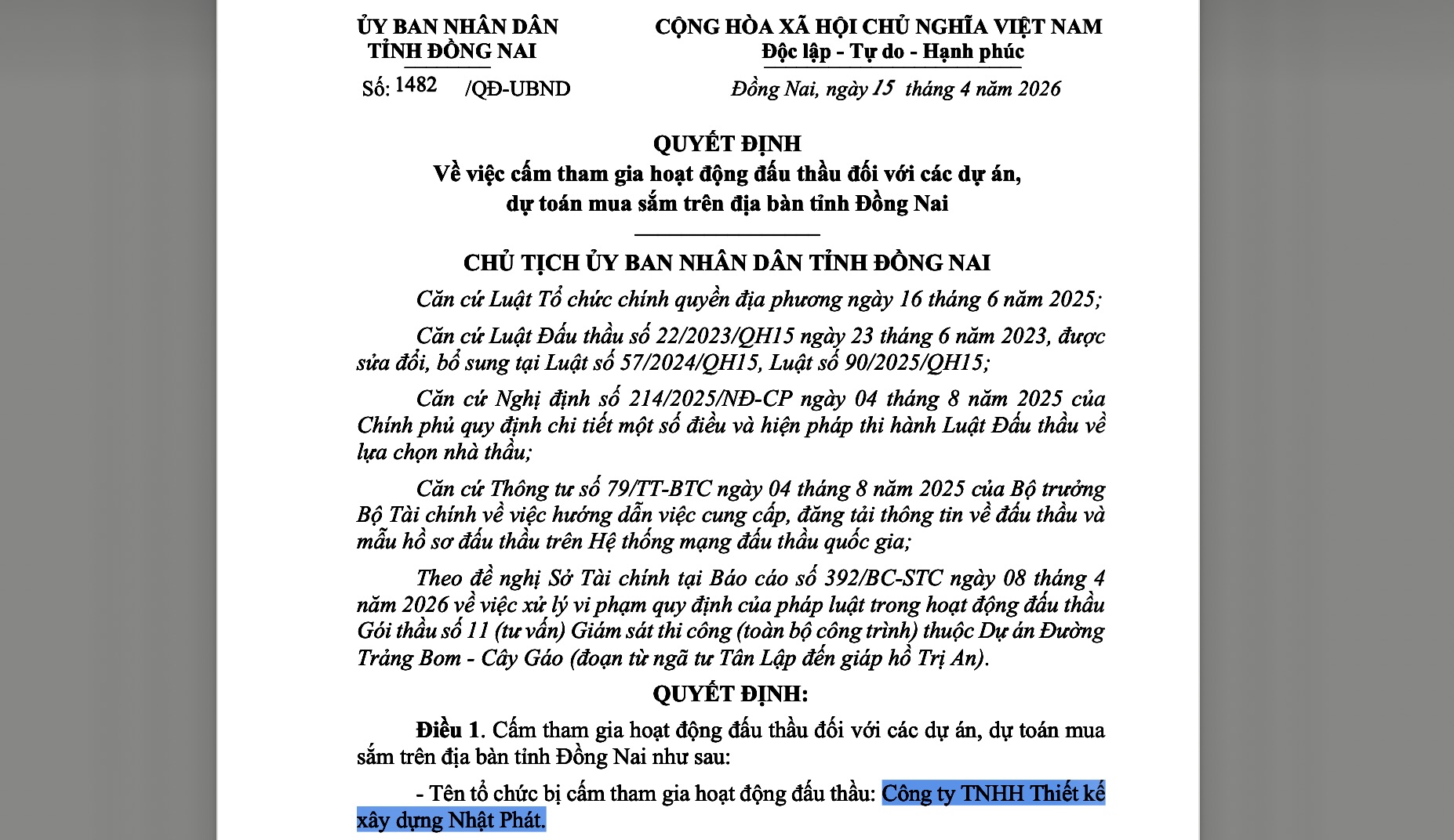 Ngày 20-4, UBND tỉnh Đồng Nai đã ra quyết định cấm tham gia hoạt động đấu thầu đối với các dự án, dự toán mua sắm trên địa bàn tỉnh đối với Công ty TNHH Thiết kế Xây dựng Nhật Phát, trụ sở tại khu phố 4 (phường Trảng Dài, tỉnh Đồng Nai).