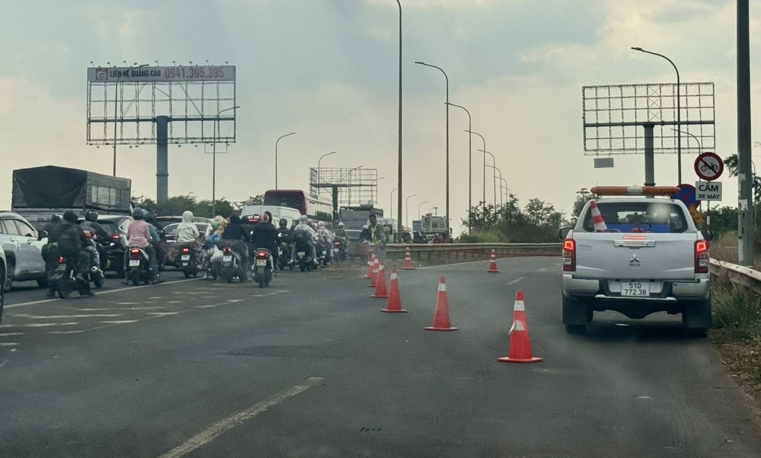 Lối vào cao tốc về thành phố Hồ Chí Minh đoạn qua khu vực Dầu Giây của tỉnh Đồng Nai bị đóng chiều 21-2 khiến luồng phương tiện từ Lâm Đồng theo quốc lộ 20 về thành phố phải dồn ra quốc lộ 1, gây ùn ứ. Ảnh: K.Nhung