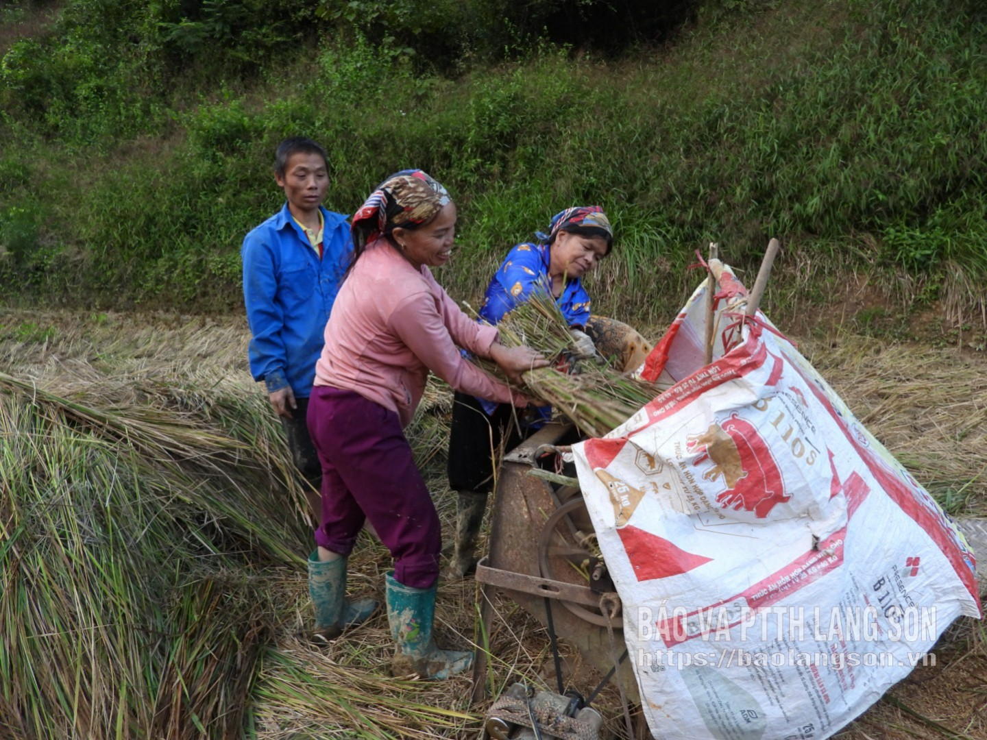 Người dân thôn Khuổi Ngành, xã Quý Hòa thu hoạch lúa mùa