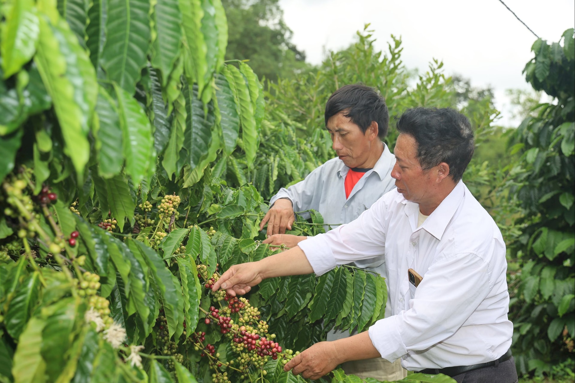 Ông Giàng A Lỳ (đứng ngoài) hướng dẫn người dân thu hoạch cà phê