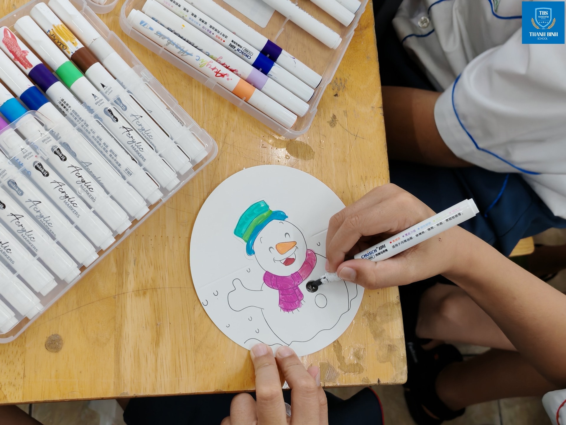 Hoạt động được mong chờ nhất là làm thiệp Giáng sinh theo nhóm, kết hợp giữa thủ công và công nghệ. Trước khi bắt tay vào thực hiện, các nhóm học sinh được xem nhanh những mẫu thiệp trên màn hình hoặc qua máy tính bảng do giáo viên chuẩn bị. Từ các gợi ý đó, các em cùng thảo luận, phân công nhiệm vụ, chia nhau từng cây bút màu, từng miếng giấy trang trí để hoàn thành sản phẩm của nhóm. Những tấm thiệp còn vụng về, chưa thật hoàn chỉnh, nhưng thể hiện rõ sự sáng tạo và khả năng hợp tác của từng em.