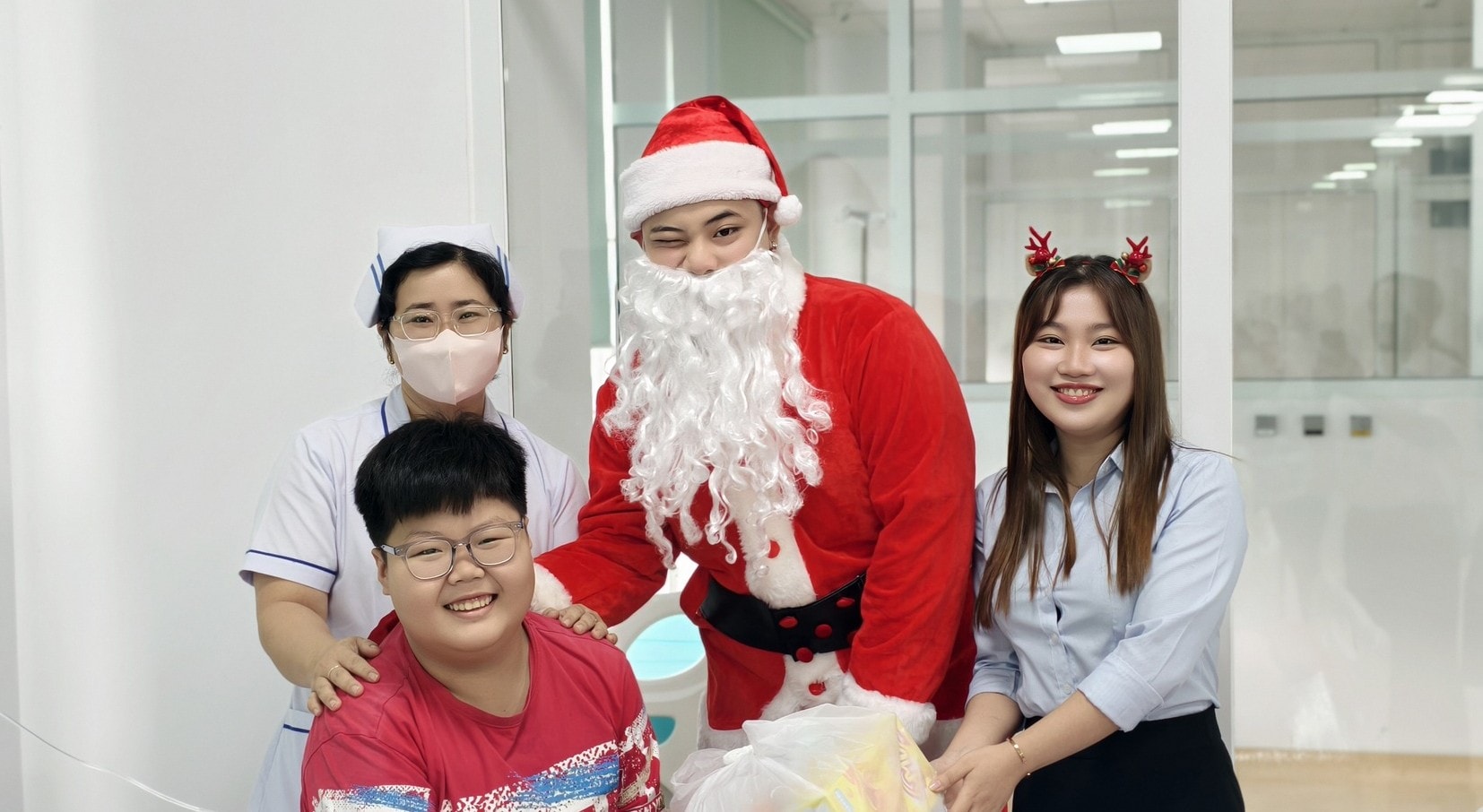 Bệnh nhân Bệnh viện Huyết học - Truyền máu thành phố Hồ Chí Minh bất ngờ nhận được sự thăm hỏi, động viên của Ông già Noel trong Ngày Giáng sinh. Ảnh: M.Hà