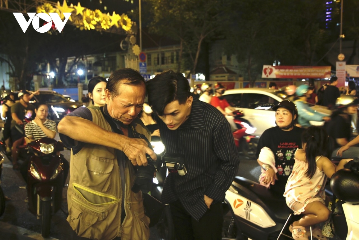 Bạn Minh Khanh (phường Thạnh Mỹ Tây) cho biết: “Chụp bằng điện thoại thì tiện thật, nhưng buổi tối ánh sáng nhiều màu rất khó canh. Quan trọng hơn là tụi mình đi đông người, ai cũng muốn có mặt trong khung hình. Nhờ các chú chụp ảnh dạo, mọi người được đứng chung với nhau, ảnh rõ nét và có cảm xúc hơn”.