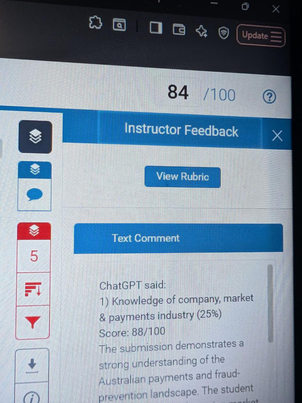 Ảnh chụp cho thấy phần nhận xét có đoạn: “ChatGPT cho rằng: Bài luận thể hiện sự hiểu biết sâu sắc về hệ thống thanh toán và phòng chống gian lận tại Australia”, cùng điểm số 88/100.