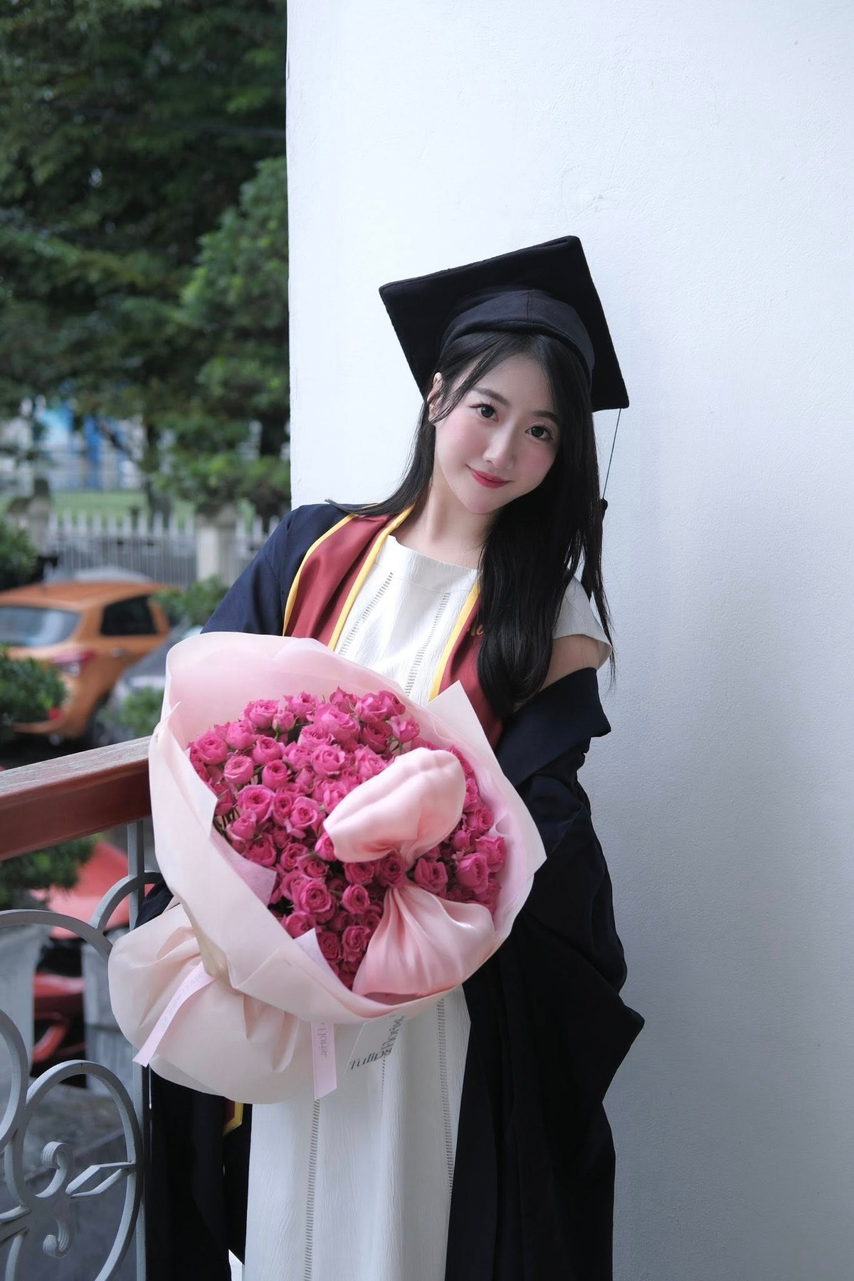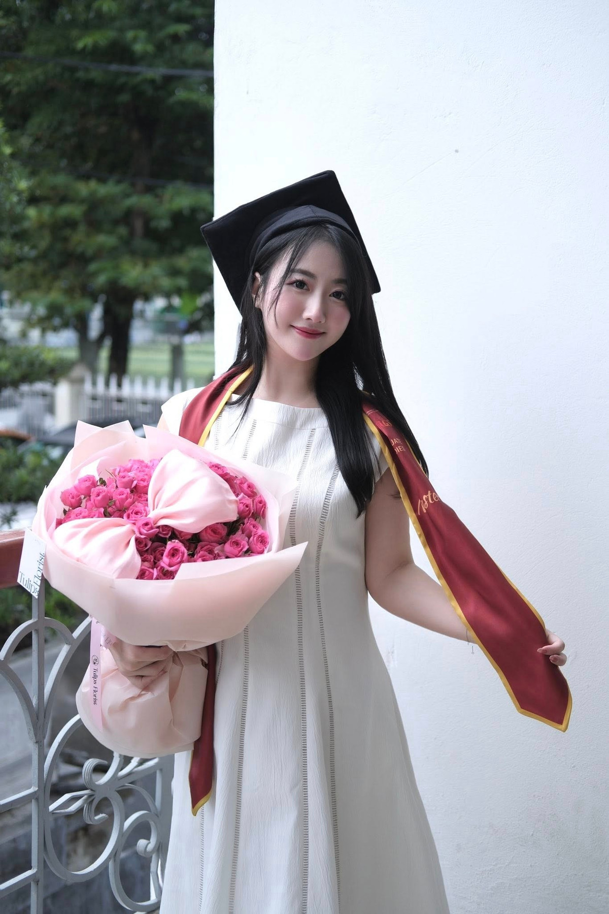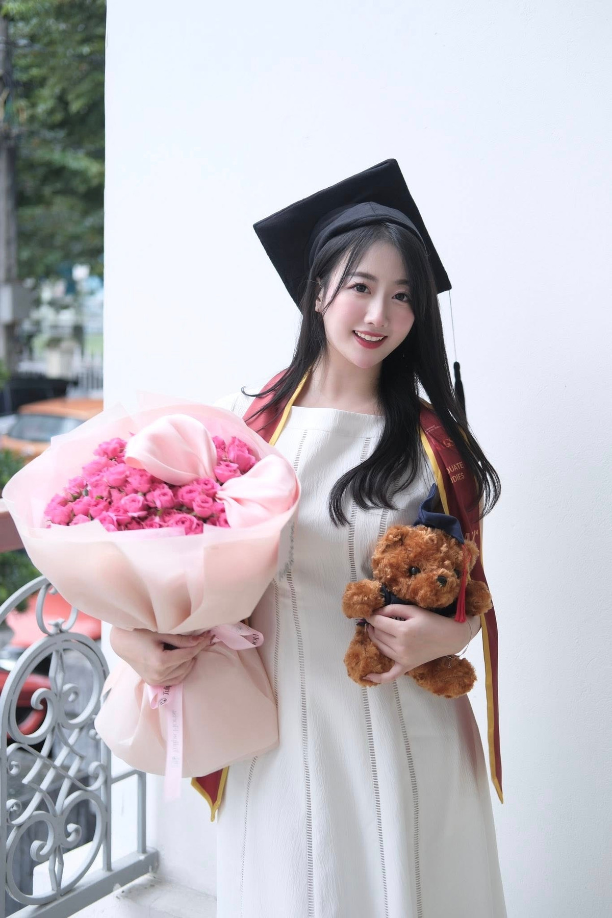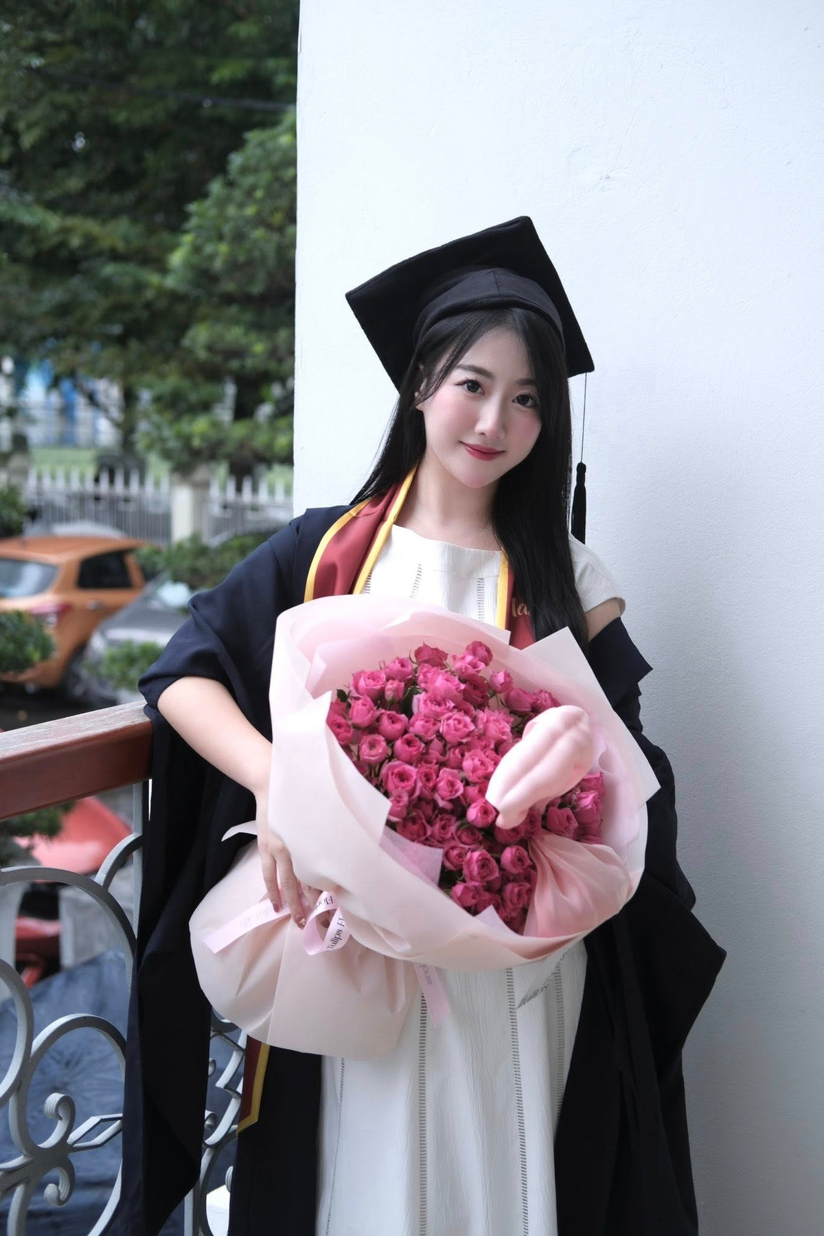 Loạt ảnh cô diện lễ phục tốt nghiệp với nhan sắc rạng rỡ, ôm bó hoa hồng lớn cùng thành tích "khủng" nhanh chóng nhận về cơn mưa lời khen từ cộng đồng mạng. (Ảnh: FBNV)