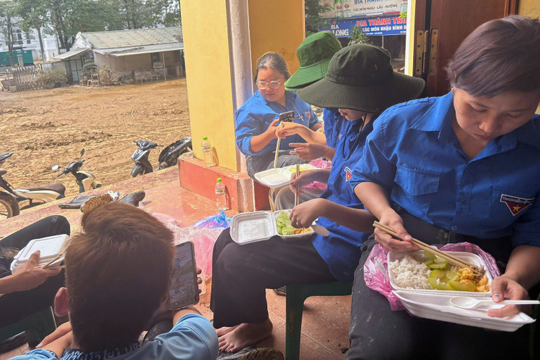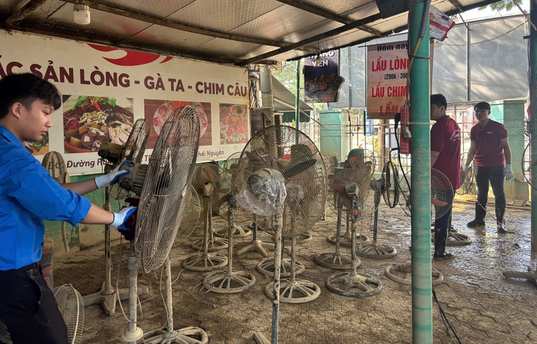 Cùng lúc này, các đội hình tình nguyện có nhiệm vụ dọn dẹp, vệ sinh, khai thông đường sá sau bão lũ vẫn hăng say tiếp tục công việc được giao. Nhiều nơi, lực lượng tình nguyện viên chỉ nghỉ tay ăn cơm trưa khi nắng đã đứng bóng trên những ngọn cây của thành phố Thái Nguyên.