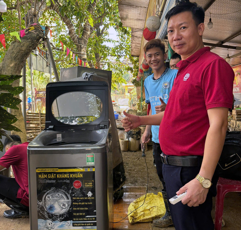 Một chiếc máy giặt hư hỏng do mưa lũ, sau khi "vào tay" các giảng viên, sinh viên tình nguyện đã hoạt động trở lại.