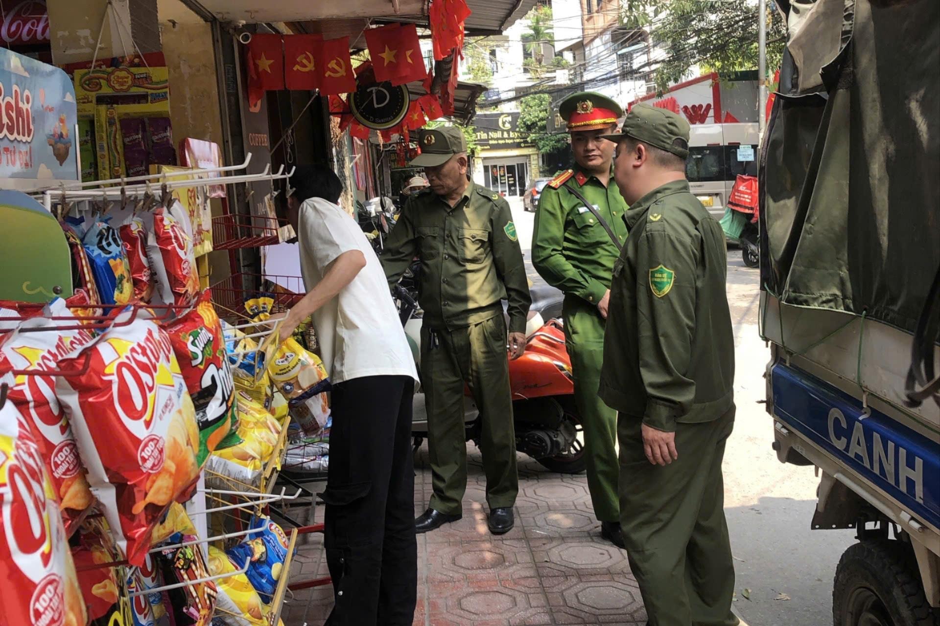 Công an phường Giảng Võ nhắc nhở, xử lý các vi phạm về trật tự đô thị. Ảnh: TT.