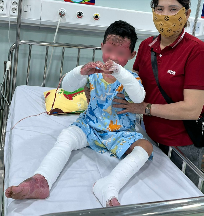 Lúc này, trẻ sốc và suy hô hấp, 65% cơ thể bỏng sâu độ 3. Toàn bộ vùngđầu, mặt, lưng, bụng, tay chân đều bị lửa cháy.