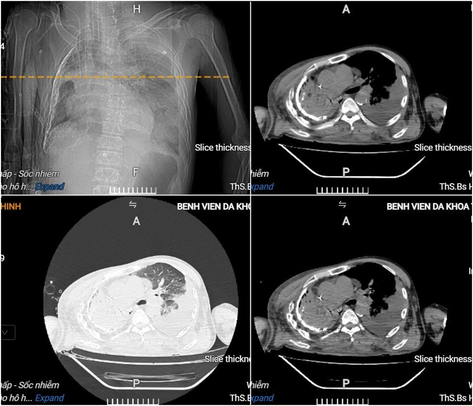 Kết quả xét nghiệm ghi nhận toan chuyển hóa, suy đa tạng, nhiễm trùng – nhiễm độc nặng, rối loạn đông máu. Hình ảnh chụp CT ngực cho thấy có áp-xe phổi trái lớn, tràn dịch màng phổi phải.