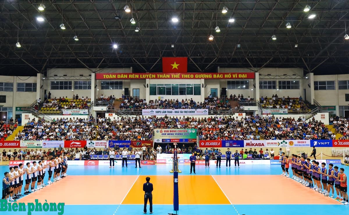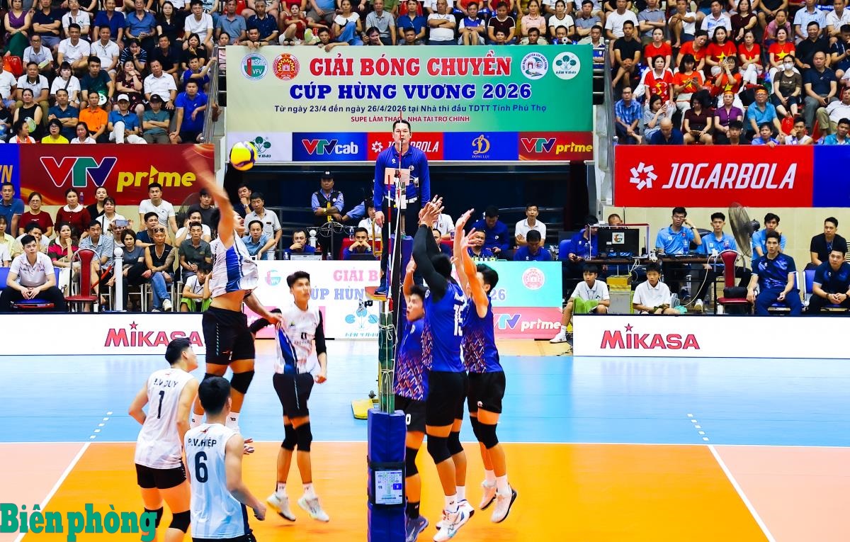 Hai đội bóng chuyền nam Biên phòng MB và Câu lạc bộ Hà Nội làm thủ tục trước khi bước vào trận bán kết Giải bóng chuyền Cúp Hùng Vương 2026. Ảnh: Thanh Xuân