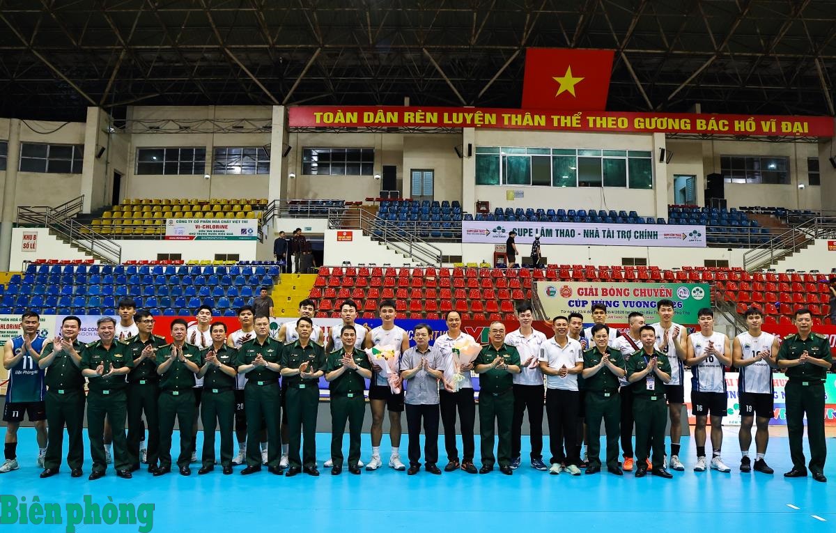 Thiếu tướng Nguyễn Văn Thiện cùng đại diện Thủ trưởng Bộ Tham mưu, các Cục tặng hoa chúc mừng đội bóng chuyền nam Biên phòng MB. Ảnh: Thanh Xuân