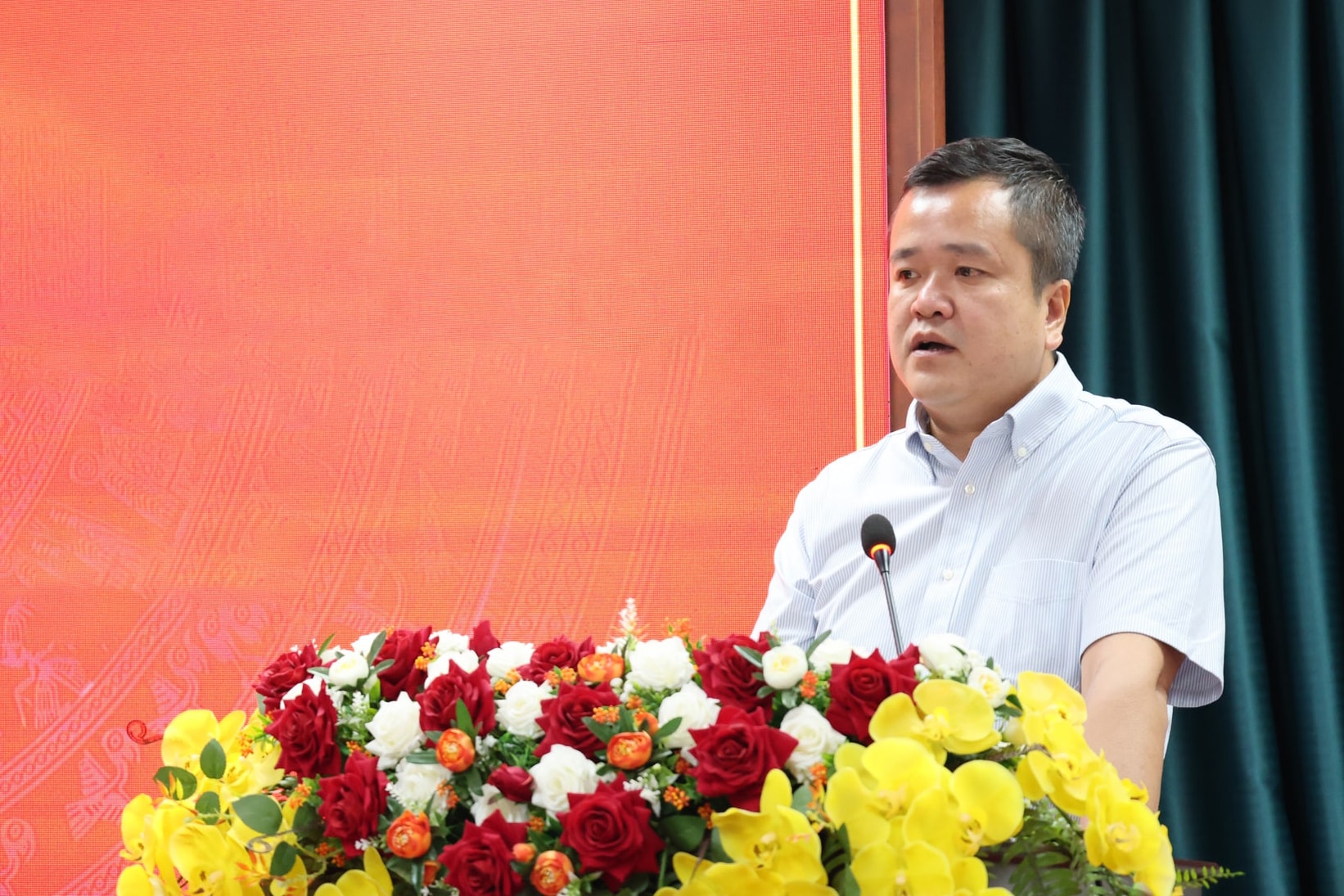 Ông Nguyễn Hà Lộc, Phó Sở Nông nghiệp và Môi trường thông tin về vụ vỡ hồ chứa nước của dự án Trang Trại Việt, xã Tuy Phong tại hội nghị giao ban báo chí tháng 10