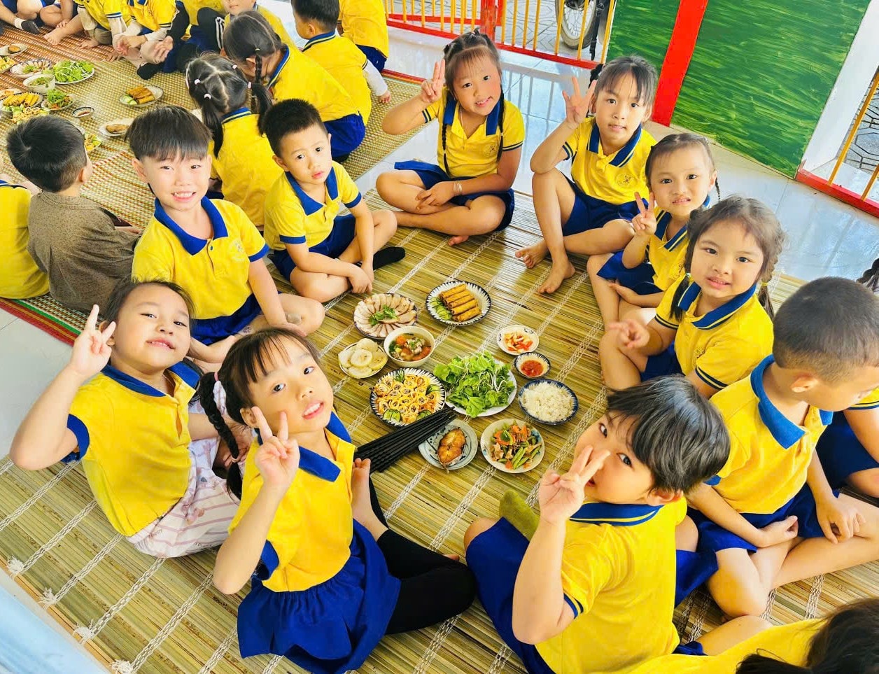 Ngoài việc chú trọng cân đối bữa ăn đầy đủ dưỡng chất theo độ tuổi, trong các hoạt động trên lớp, giáo viên đều có sự tích hợp nội dung giáo dục về dinh dưỡng, giá trị thực phẩm cho trẻ. Từ đó củng cố kiến thức, định hướng cho trẻ trong việc lựa chọn thực phẩm và dinh dưỡng cho bản thân.